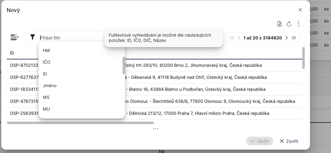 Vyhledávání subjektů se realizuje prostřednictvím filtru na řádku filtru. Uživatel může buď přímo fulltextově vyhledávat, nejčastěji podle Názvu vytvářeného potenciálního dodavatele nebo podle IČO nebo IČP (Identifikační číslo provozovny). Druhou možností je kliknutí na řádek Filtr a aplikace nabídne různé druhy filtru.