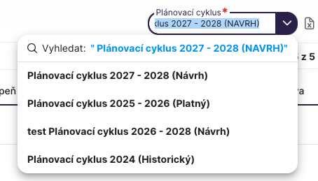 Uživatel pro práci v modulu hospodářské mobilizace musí vybrat v pravé horní části obrazovky konkrétní plánovací cyklus. Pro zobrazení požadavků na MD nebo dalších kategorií v modulu Hospodářské mobilizace může vybrat plánovací cyklus ve stavu Platný nebo Historický (nebude moci žádný záznam editovat či přidávat nový).