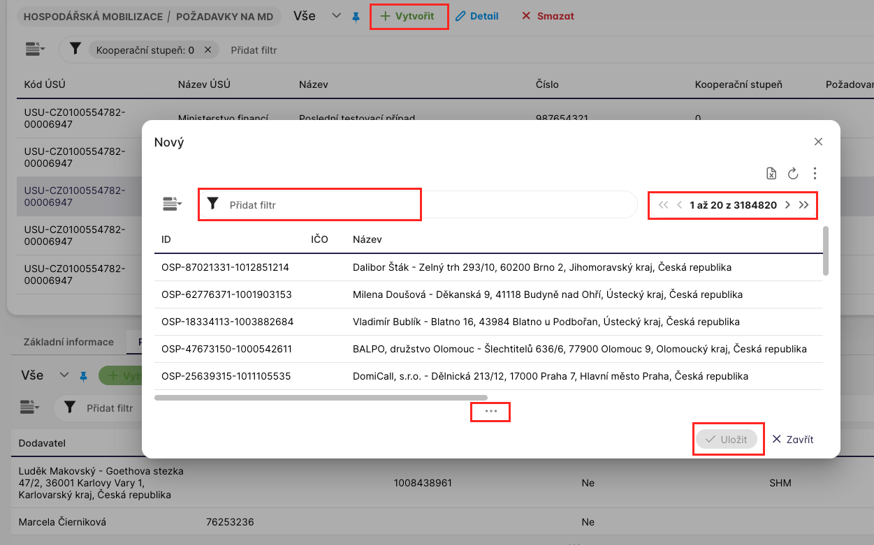 Uživateli se zobrazí výběr ze všech subjektů typu Organizace a Organizační složka podniku, které nemají omezenou platnost a které již jako potenciální dodavatelé nejsou k požadavku na MD přiřazeny.