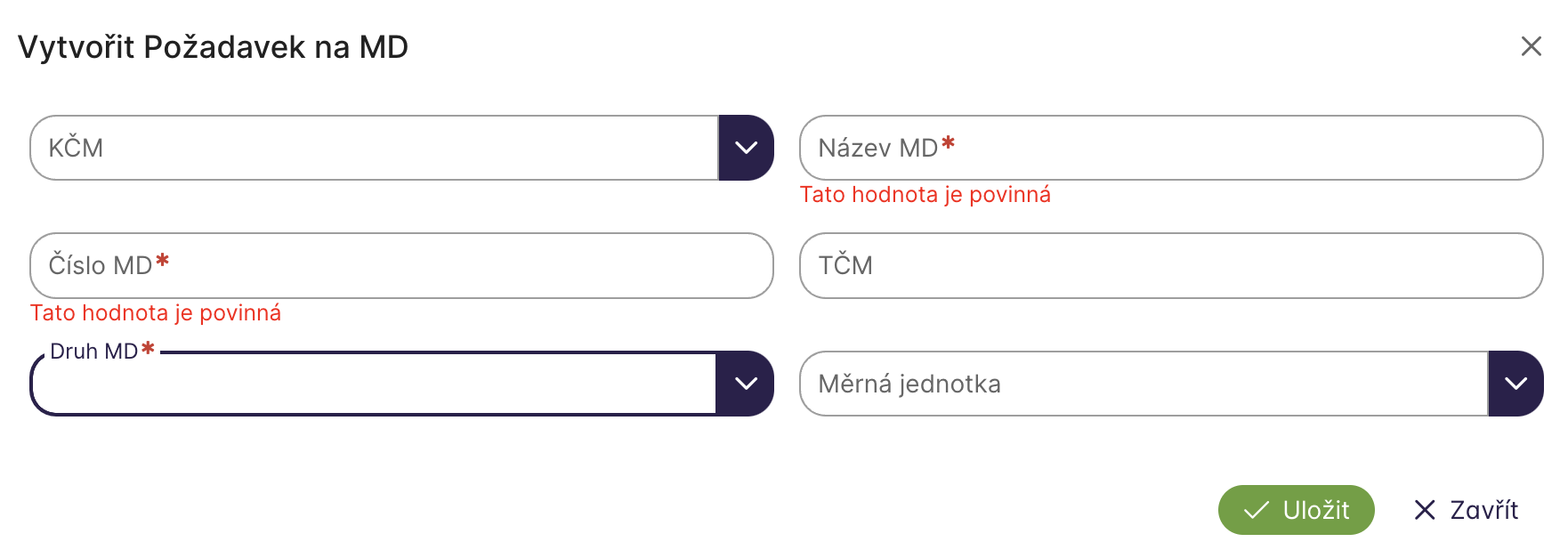 Uživateli se zobrazí formulář pro nový požadavek, kdy povinně vyplňuje název požadavku, Číslo MD, které musí mít právě 13 numerických znaků, Druh mobilizační dodávky, měrnou jednotku. Uživatel může též zvolit z číselníku KČM pro jeho ÚSÚ definovanou položku Katalogového čísla materiálu pro předvyplnění některých polí. Vyplnění všech povinných polí a stisknutí tlačítka Uložit je vytvořen nový požadavek a uživatel je přesměrován na obrazovku detailu právě vytvořeného požadavku na MD.
