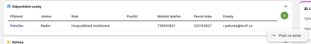 Dvojím kliknutím na záznam nebo kliknutím na ozubené kolo a zvolení možnosti Přejít na detail se uživatel dostane na podrobnosti odpovědné osoby.