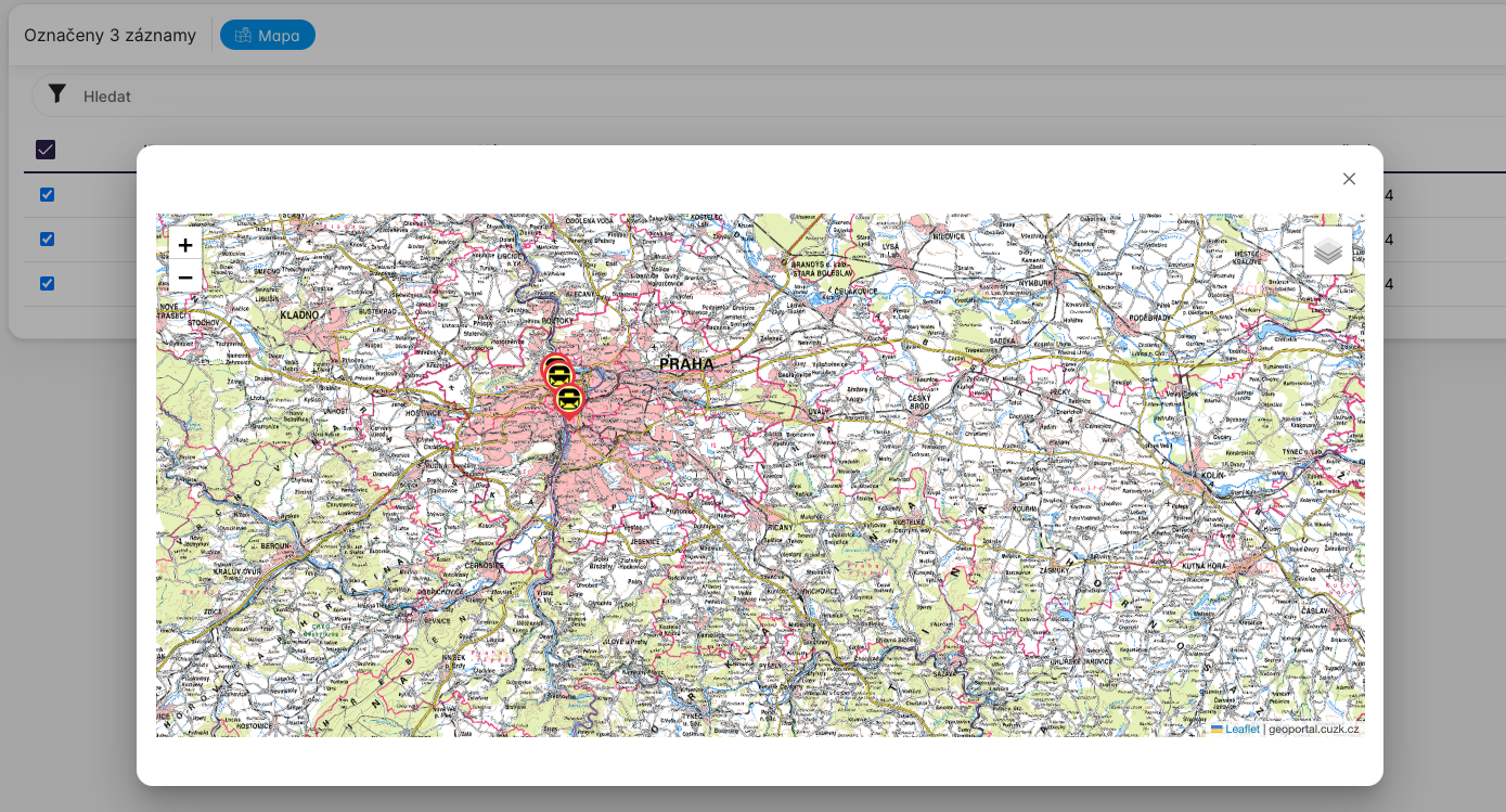 Vybráním jednoho objednatele v zaškrtávacím poli v levé části přehledu nebo všech bez zaškrtnutí a stisknutí tlačítka Mapa se zobrazí přehled objednatelů dle primární adresy objednatele. Po najetí na ikonu na mapě se zobrazí název objednatele a jeho adresa.