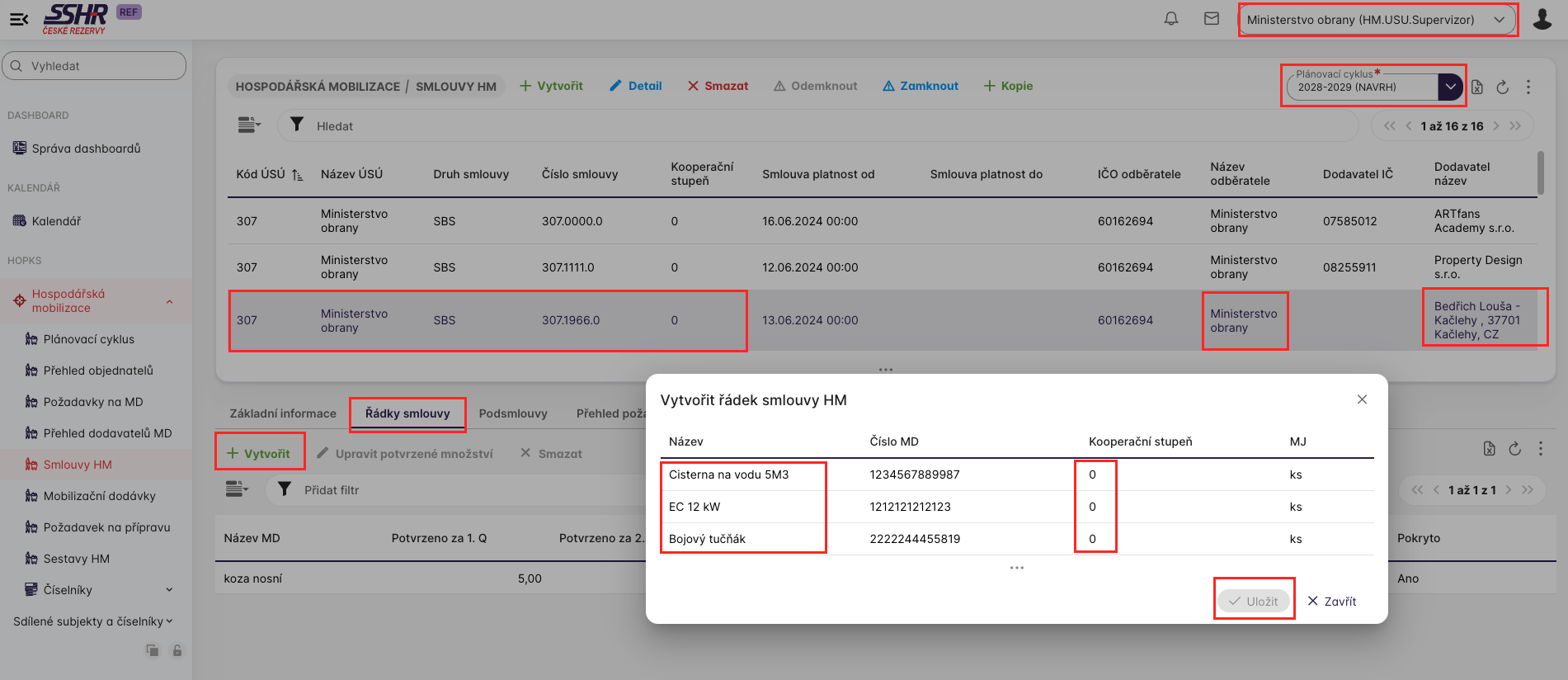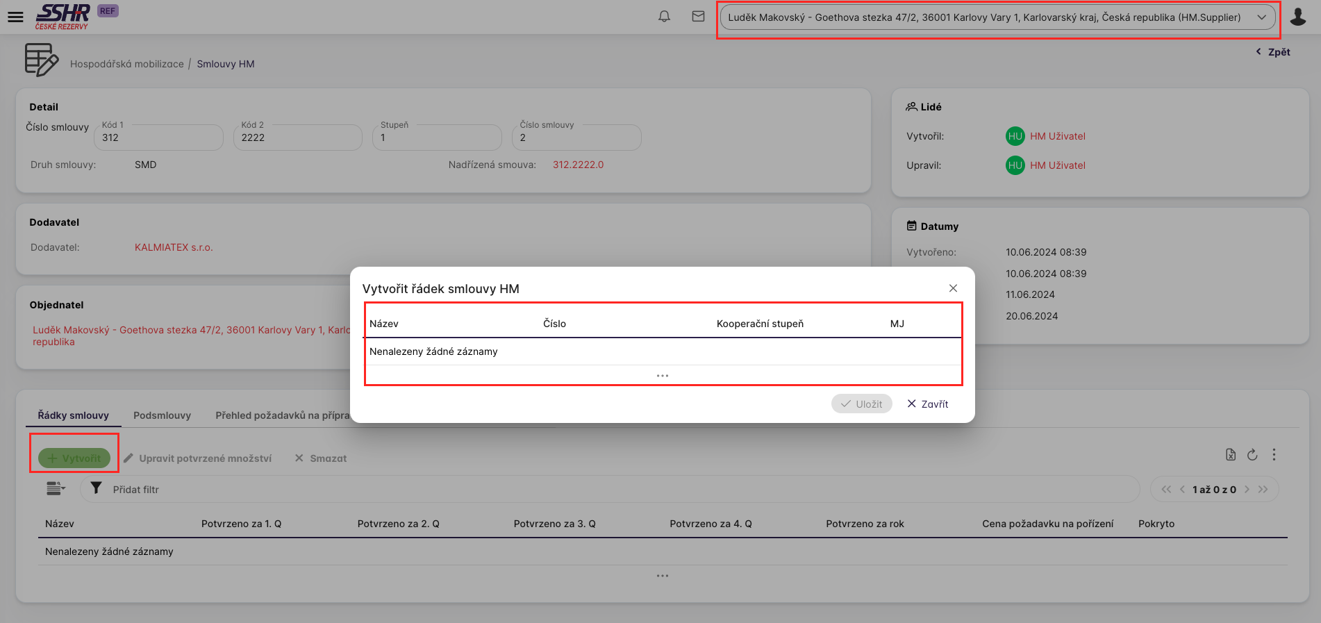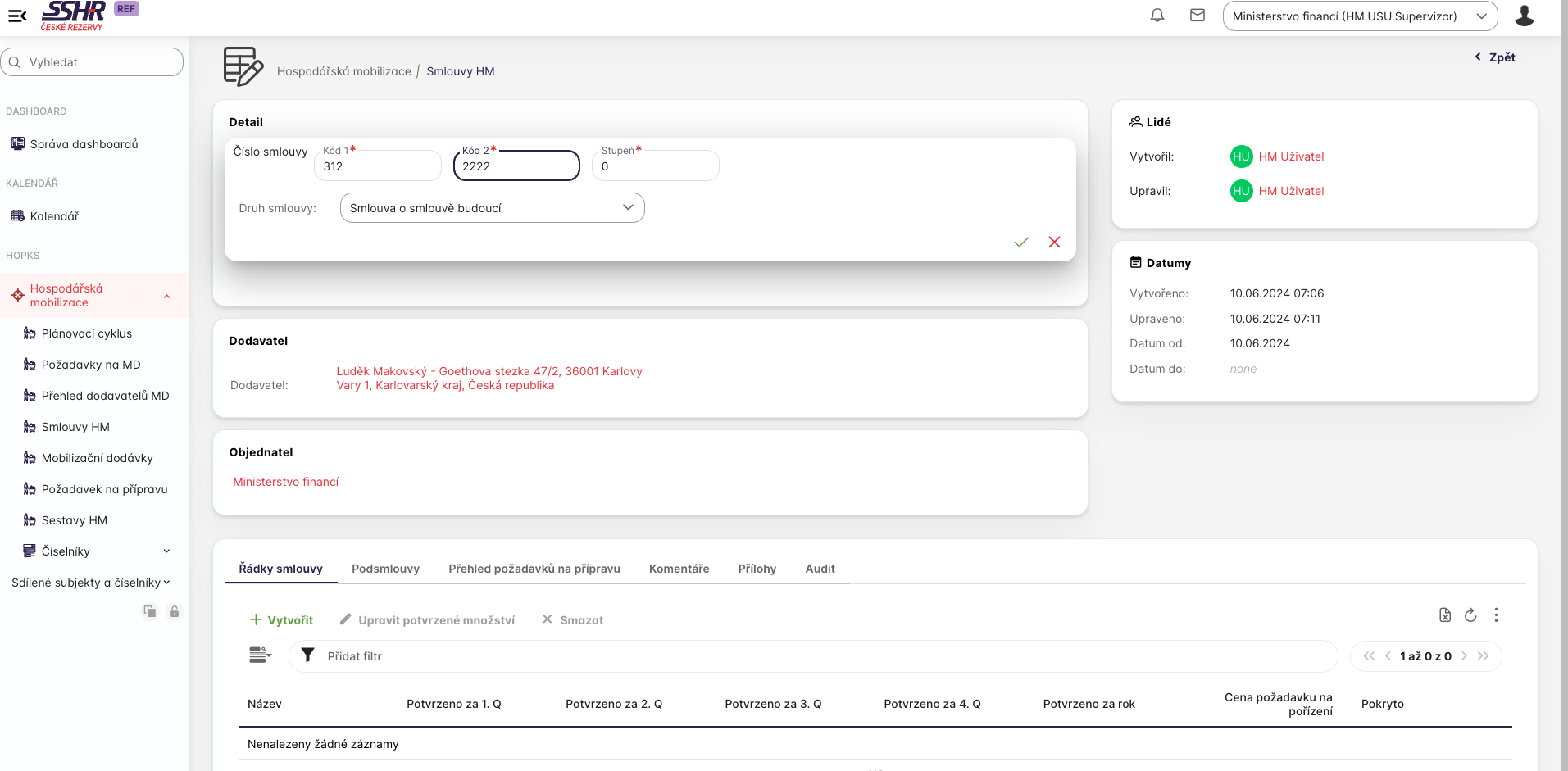 Uživatel s přiřazenou rolí HM.SSHR. Supervizor u (finální) smlouvymůže stisknutím tlačítka Vytvořit na záložce Řádky smlouvy a přidat nový řádek této smloiuvy. Platí základní pravidlo, že jeden řádek smlouvy nebo podsmlouvy odpovídá jednomu požadavku na MD nebo poddodávce.