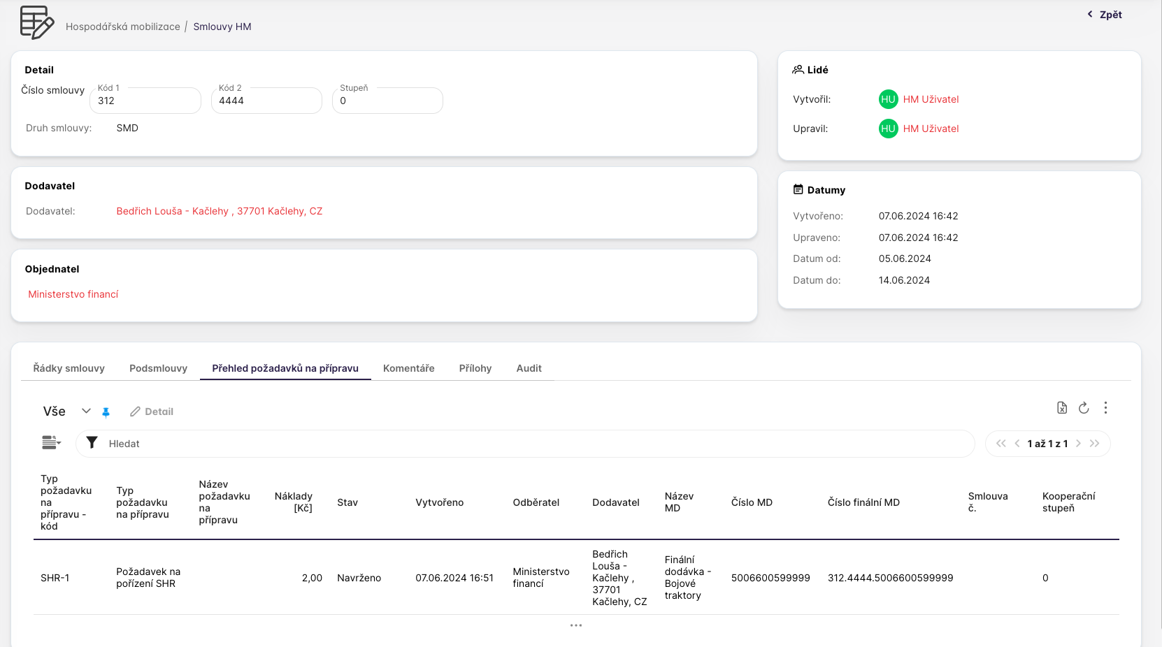 V záložce Přehled požadavků na přípravu je zobrazen přehled požadavků vážící se k vybrané smlouvě a všem jejím podsmlouvám. V této záložce nelze vytvářet nové požadavky na přípravu, to musí být realizováno na konkrétním řádku smlouvy, který se váže na požadavek na MD či poddodávku MD.