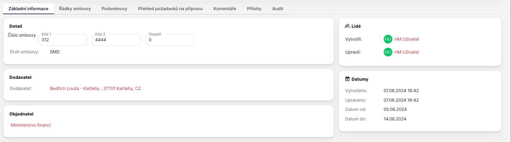 Na detailu smlouvu může uživatel vidět Sekci detail, která ukazuje strukturu čísla smlouvy s kódem ÚSÚ objednatele a kódem finální smlouvy. Dále je vidět jakého druhu smlouva HM je a mezi jakým objednatelem a dodavatelem je smlouva uzavřena.