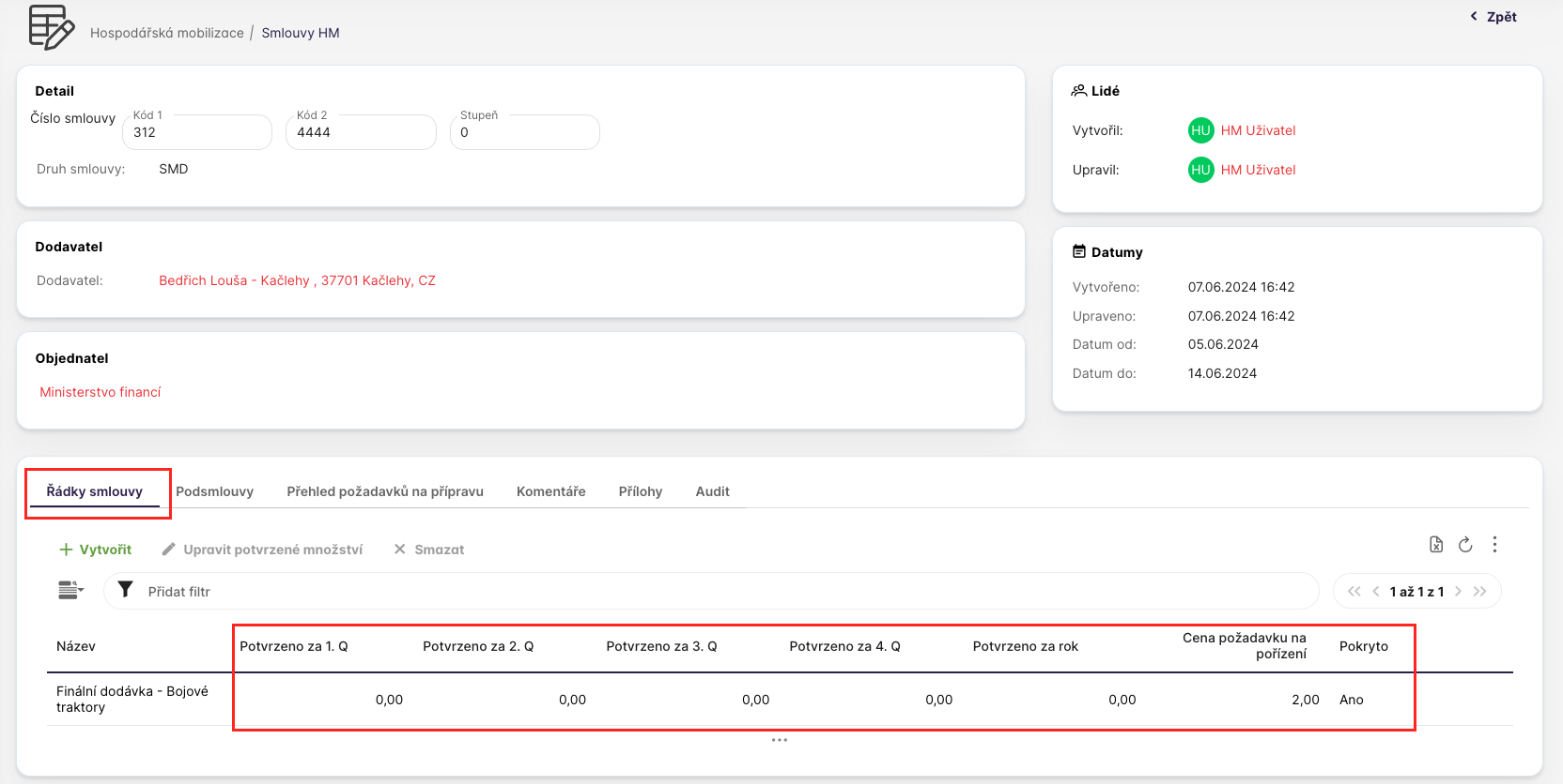 Na záložce Řádky smlouvy může uživatel vidět jednotlivé požadavky na MD přiřazené ke smlouvě. Smlouva může mít jeden nebo více řádků smlouvy. Zároveň na řádku smlouvy uživatel vidí i potvrzené množství za jednotlivá čtvrtletí dodavatelem.