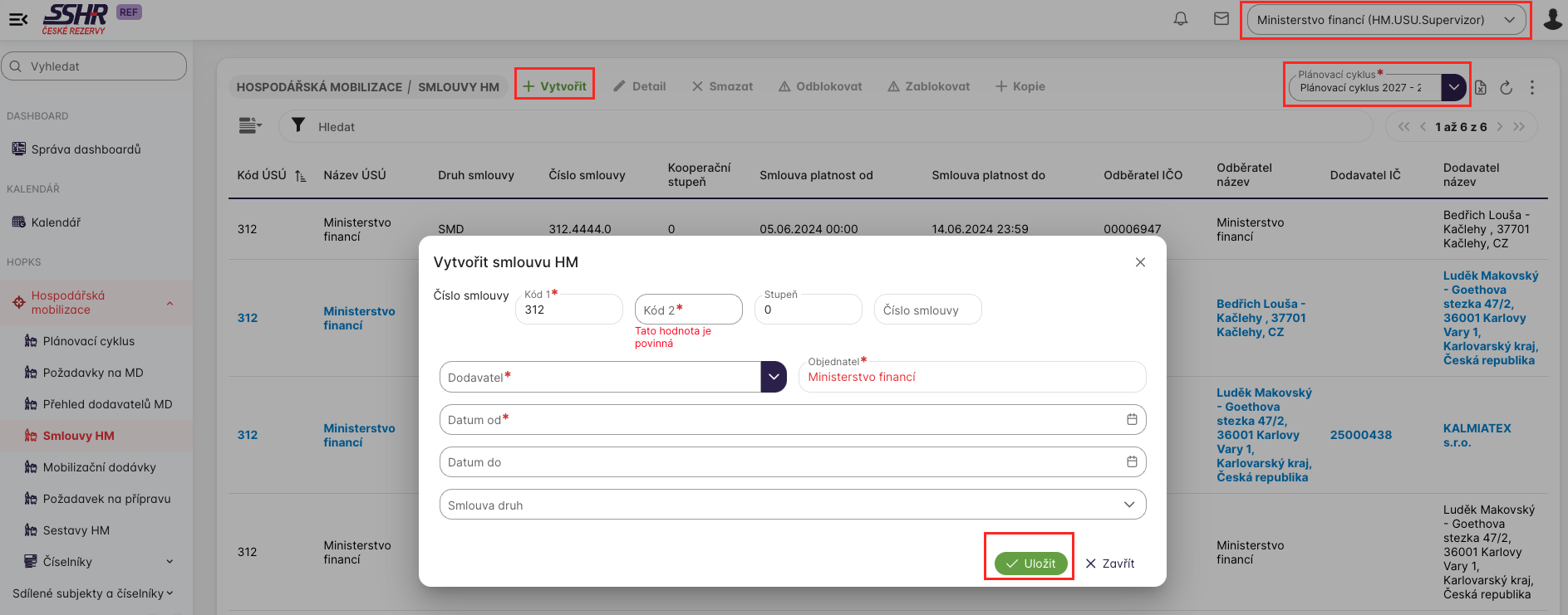 Uživatel s přiřazenou roli HM.USU.Supervizor může vytvářet novou (finální) smlouvu, pokud je vybrán plánovací cyklus ve stavu Návrh. Kliknutím na tlačítko Vytvořit se zobrazí formulář pro novou smlouvu s předvyplněnými údaji - objednatel, části kódu smlouvy. Vyplněním povinných polí a potvrzením tlačítka Uložit uživatel vytvoří novou smlouvu a je přesměrován na její detail.