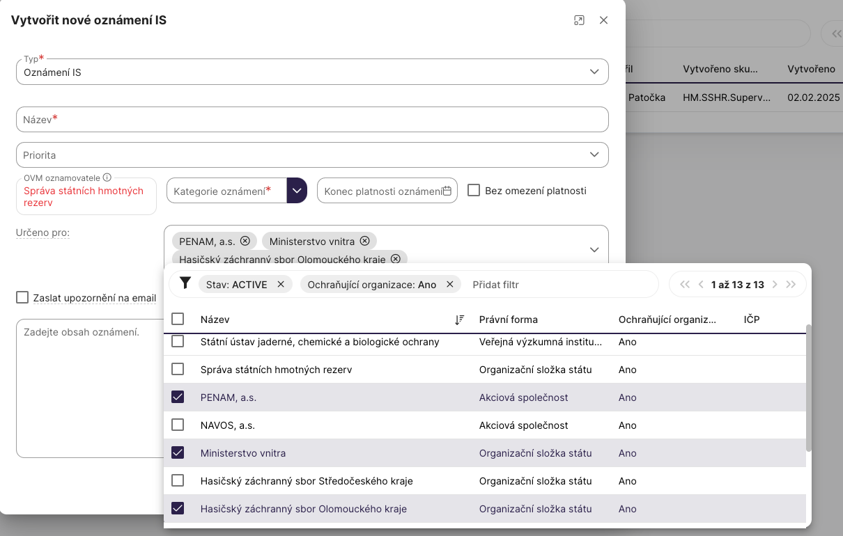 Uživatel dále volí, kterým orgánům veřejné moci nebo ochraňovateli bude oznámení určeno, může zvolit vícero orgánů nebo uživatelů. Standardně může po kliknutí do pole Určeno pro filtrovat a vyhledávat.