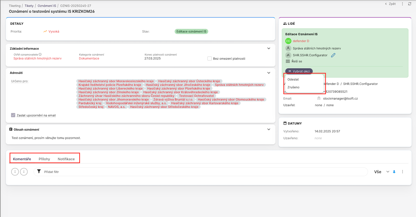 Poté, co je s editací oznámení hotový a je si jistý, že má vše správně zadáno, může kliknout na tlačítko Vybrat akci v procesním okně s názvem procesního kroku Editace oznámení. Může vybrat Odeslat nebo Zrušeno. V případě Zrušeno se oznámení automaticky dostane do stavu Uzavřeno a nikomu se nezasílá notifikace ani se nezobrazuje v přehledu Oznámení.