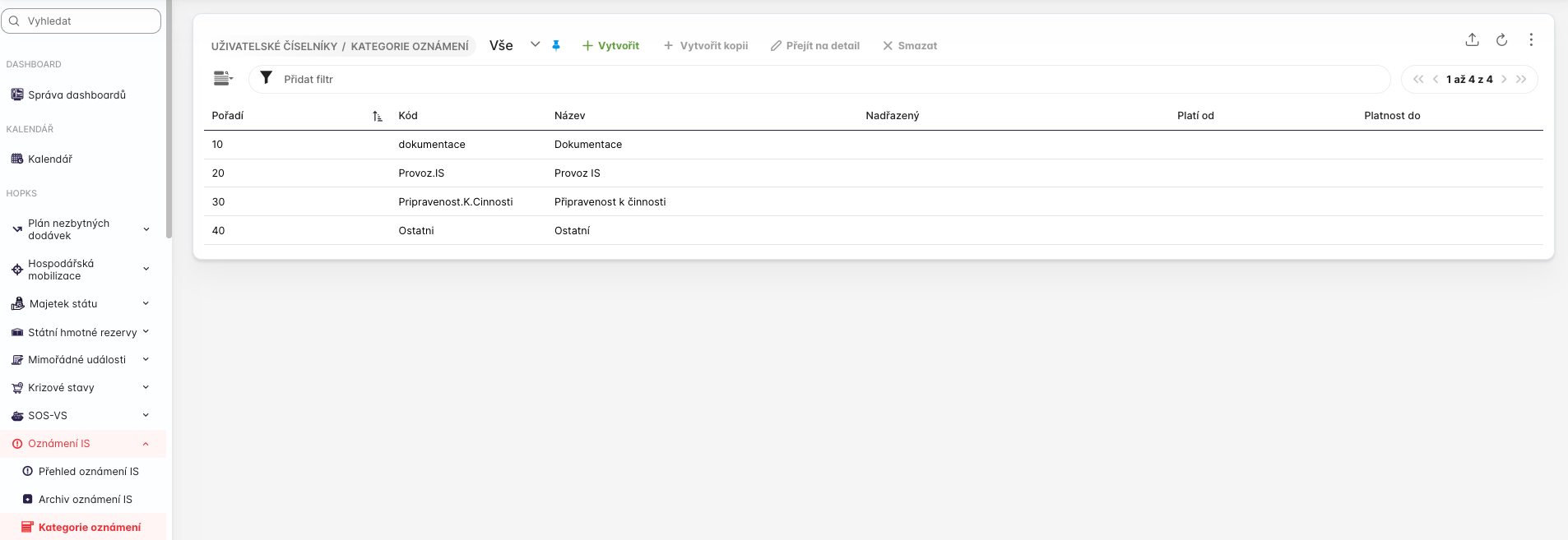 Uživatelé, kterým je přiřazena jedna z rolí, které mohou vytvářet oznámení, mají právo na správu číselníku oznámení. Číselník je dostupný v navigačním menu pod položkou Kategorie oznámení.