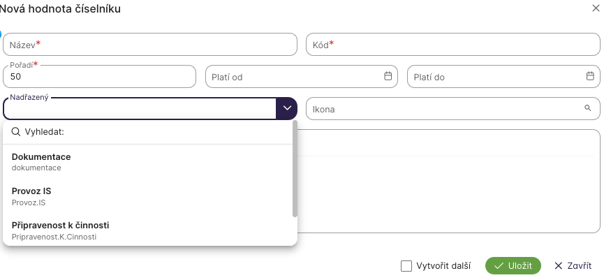 Kliknutím na tlačítko + se otevře dialogové okno, kam stačí zadat údaje Název a Kód a potvrdit stisknutím tlačítka Uložit. Pořadí je předvyplněno, jeho změnou na nižší číslo oproti jiným záznamů se bude nabízet dříve při výběru kategorie oznámení. v poli Nadřízený je možné vybrat již existující kategorii a vytvořit tak hierarchickou strukturu typů oznámení. Kód kategorie by neměl mít diakritiku a tzv. bílá místa (mezery).