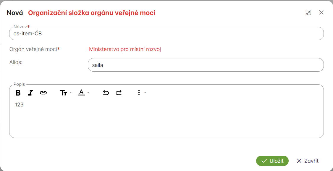 Ve formuláři se vyplní pole „Název, alias, popis“ pro novou organizační složku a předvyplní se pole ÚSÚ podle ÚSÚ uživatele