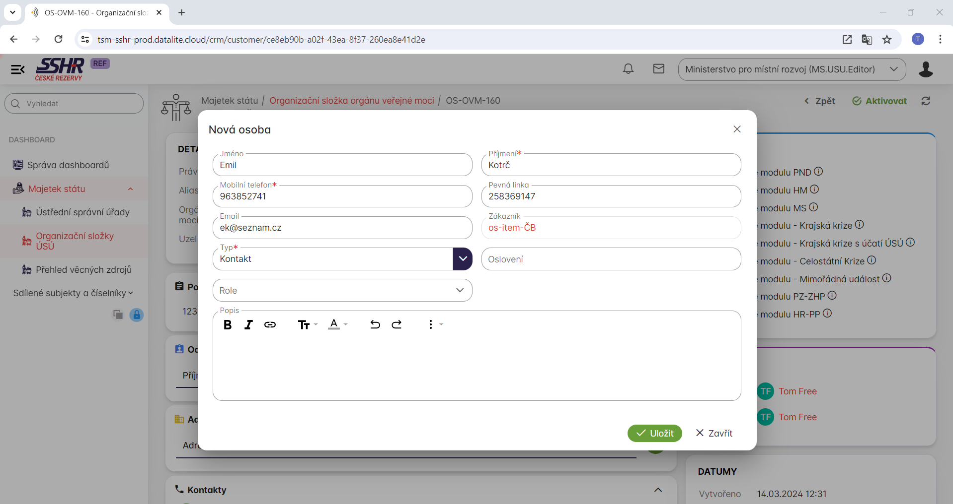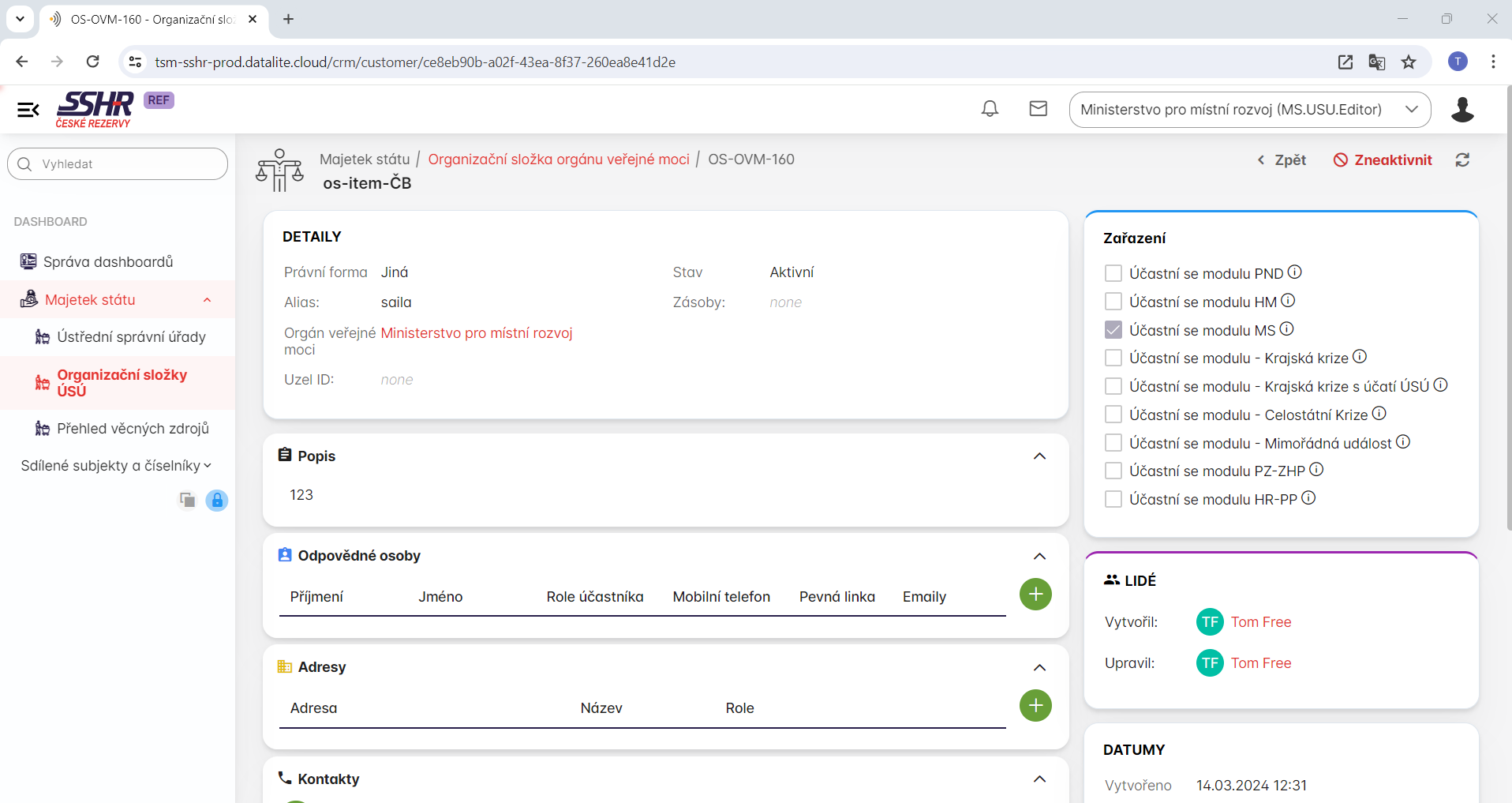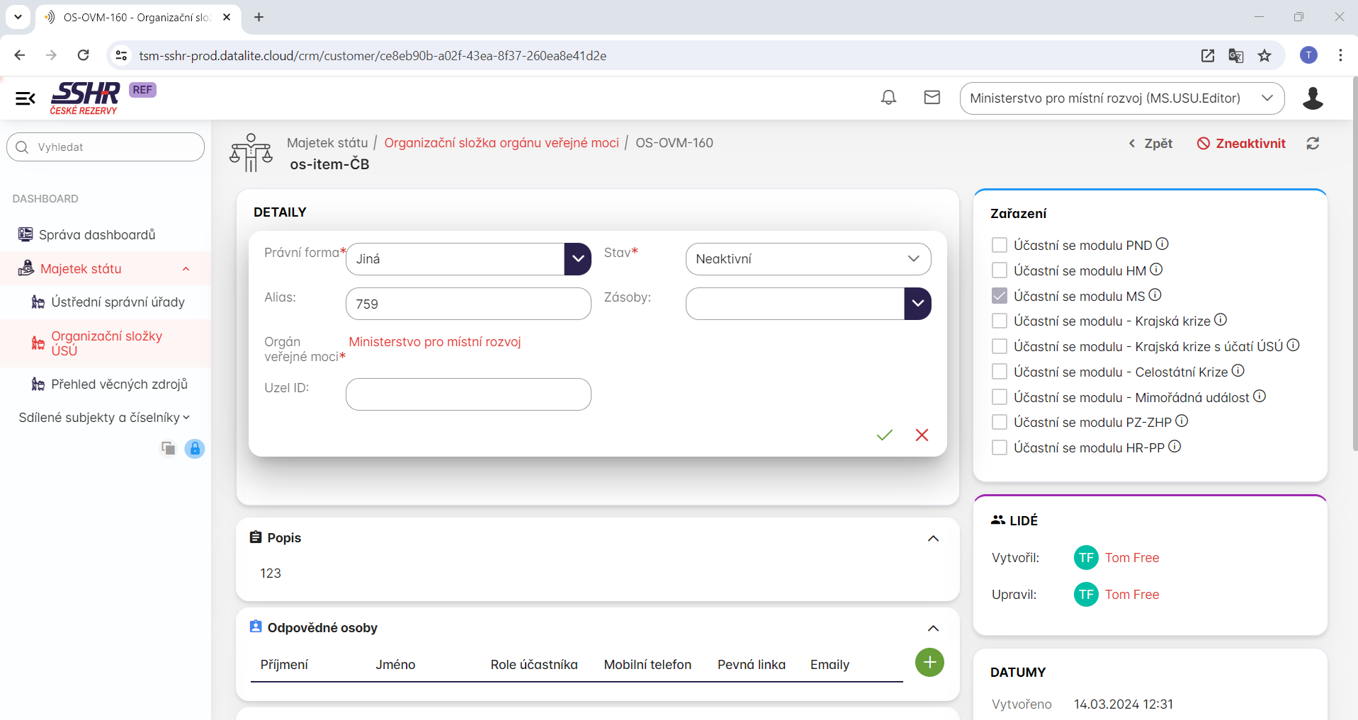 Přidání nové odpovědné osoby do detailu organizační složky ÚSÚ