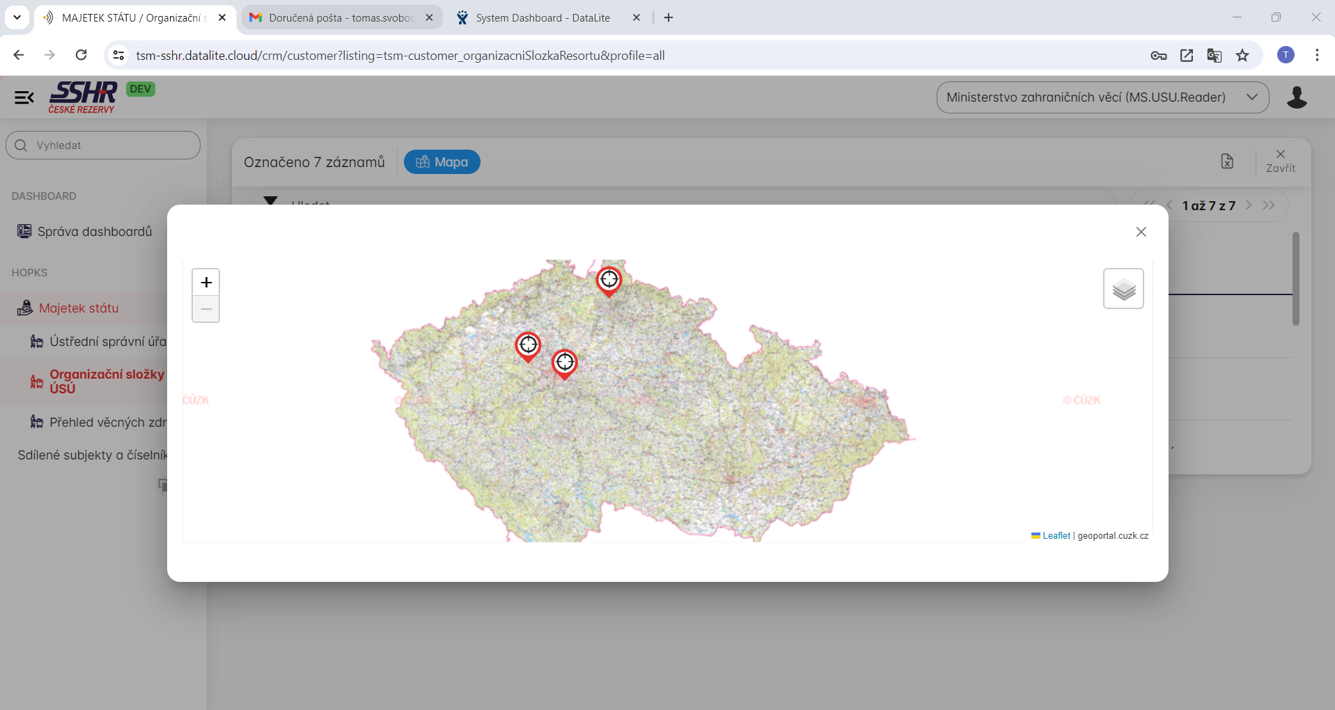 Na obrazovce s tabulkou organizačních složek ÚSÚ se kliknutím na zaškrtávací tlačítko vedle názvu sloupce „ID“ zobrazí modré tlačítko „Mapa“. Kliknutím na zaškrtávací tlačítko se vyberou všechny záznamy v tabulce . Pro zobrazení konkrétních záznamů na mapě je nutné zaškrtnout konkrétní záznamy manuálně. Kliknutím na tlačítko „Mapa“ zobrazí formulář s mapou ČR a značkami organizačních složek v místě jejich adresy.