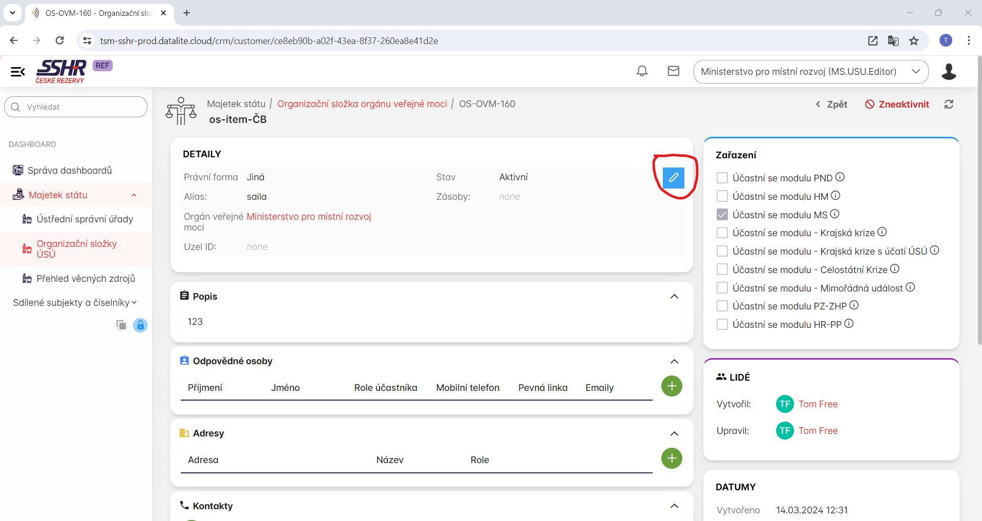Při najetí kurzoru na formulář „Detaily“ se v pravém horním rohu objeví tlačítko pro editaci dat organizační složky