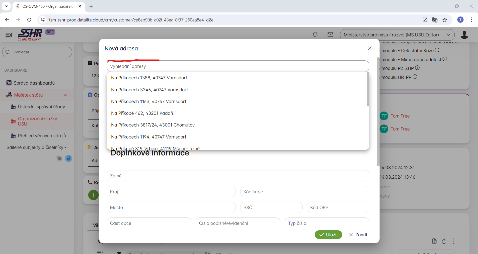 V detailu záznamu organizační složky se po kliknutí na zelené tlačítko „+“ u formuláře „Adresy“ zobrazení formulář „Nová adresa“ pro vyplnění adresy organizační složky organizační složky bez vyplněné adresy nebudou viditelné na mapě