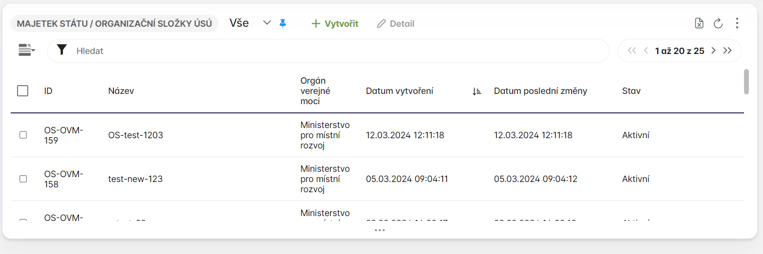 Kliknutím na tlačítko uložit se zobrazí detail nové organizační složky a zobrazí se v tabulce na komponentě „Organizační složky ÚSÚ“