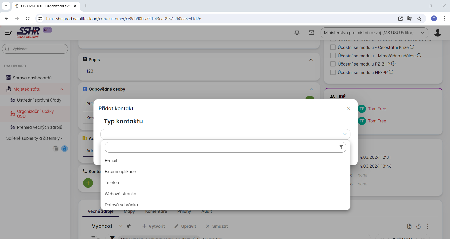- V detailu záznamu organizační složky se při kliknutí na zelené tlačítko „+“ u formuláře „Kontakty“ zobrazí formulář „Přidat kontakt“, ve kterém se vybírá typ kontaktu