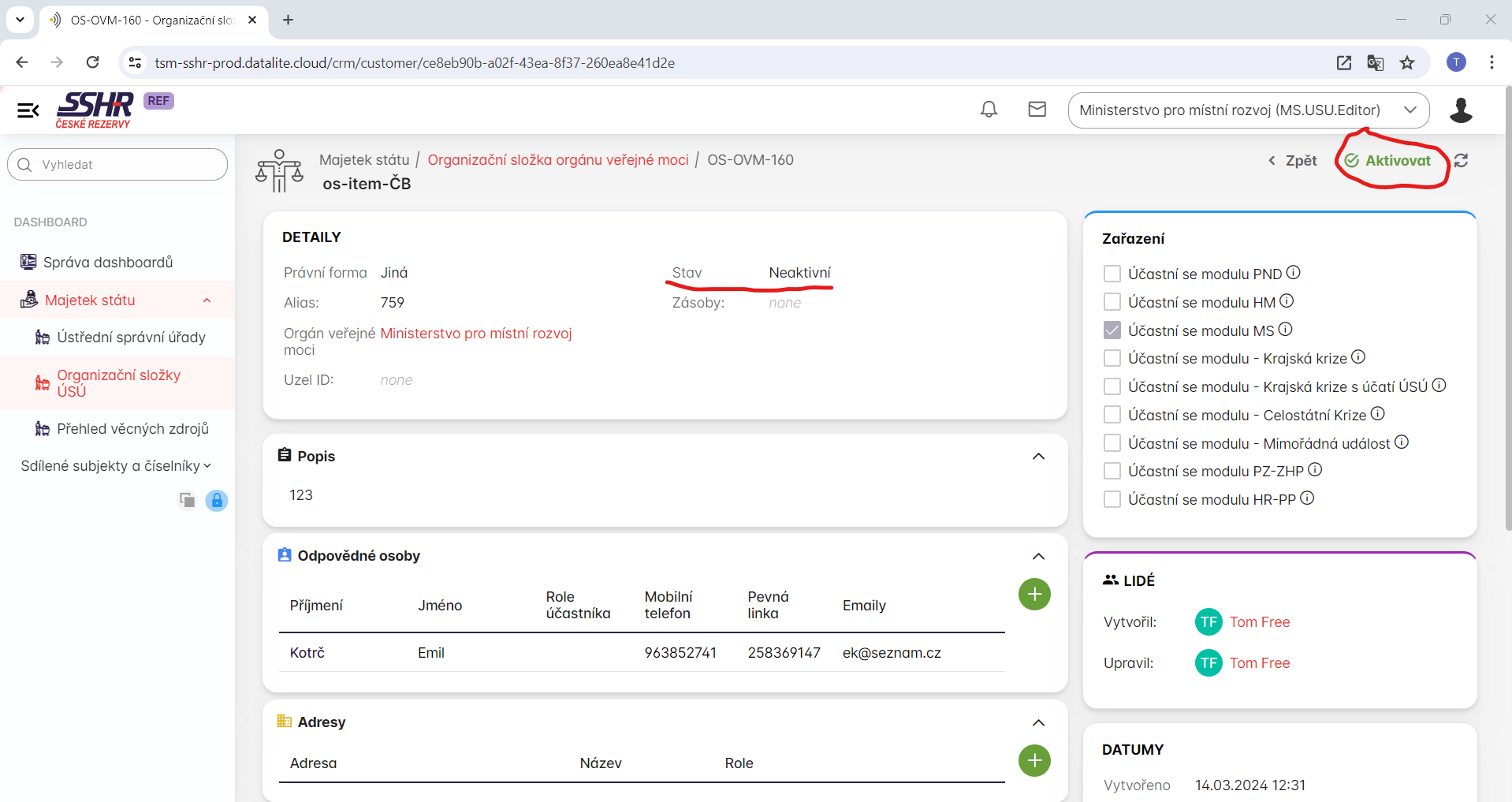 Kliknutím na zelené/červené tlačítko „Aktivovat“/“Zneaktivnit“ v pravém horním rohu obrazovky se změní „Stav“ organizační složky. V případě, že jsou organizační složce přiřazeny „věcné zdroje“ není možné organizační složku zneaktivnit => neaktivní organizační složce nelze přiřadit „věcný zdroj“.