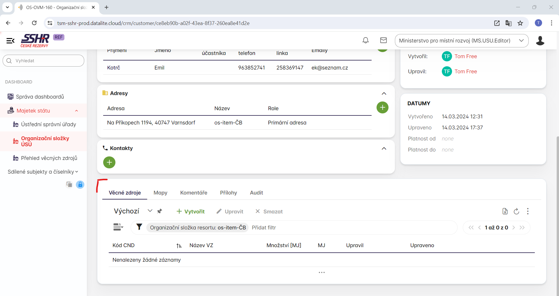 - Karta „Věcné zdroje“ slouží k vytvoření, upravení, nebo smazání věcného zdroje přiřazeného organizační složce