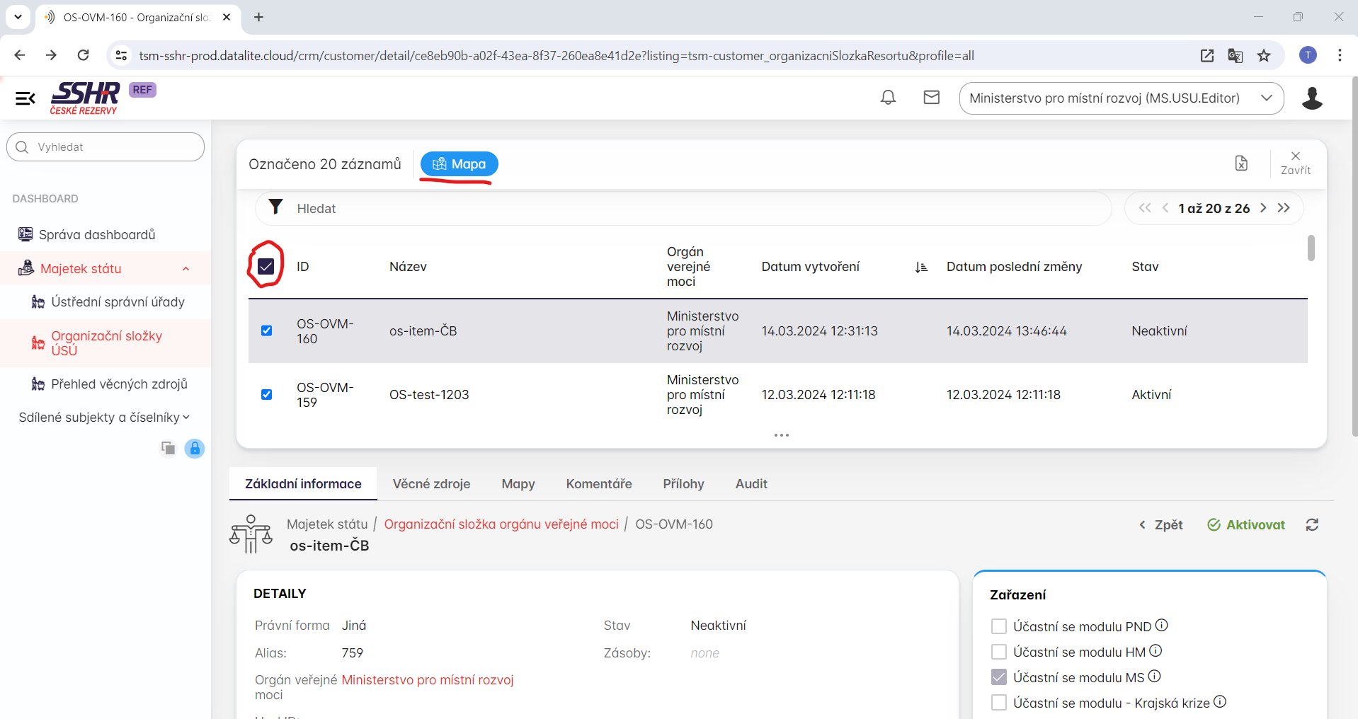 Pro aktivování/zneaktivnění organizační složky je nutné být přihlášen pod uživatelem s rolí MS.USU.Editor