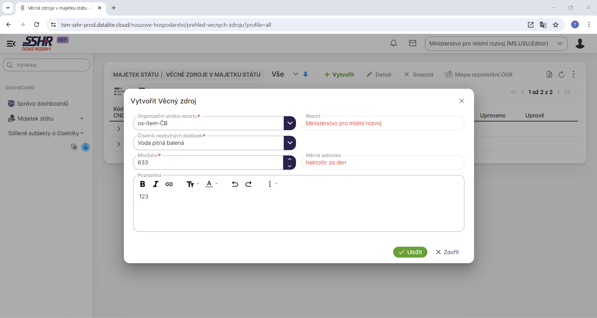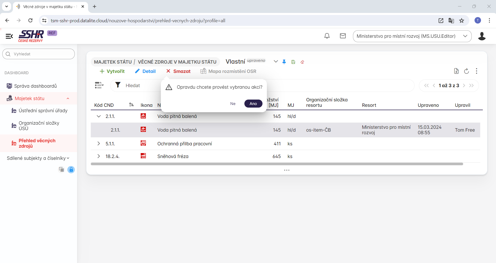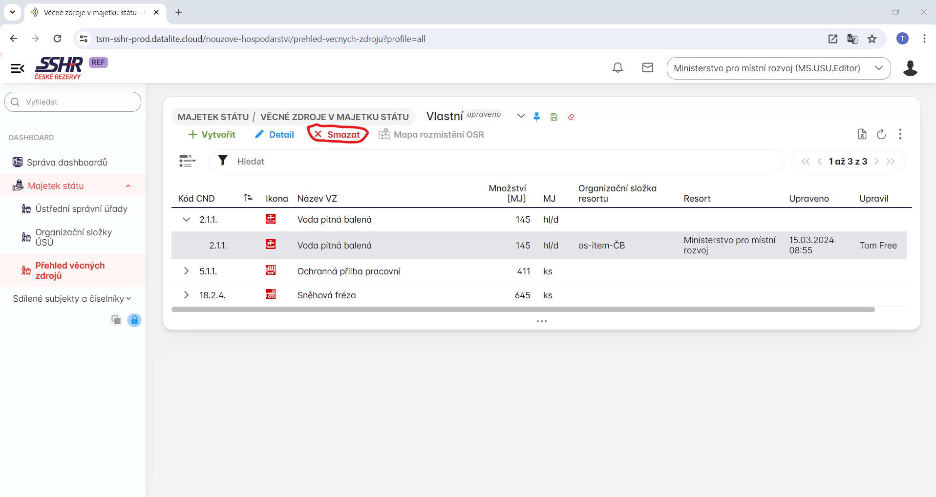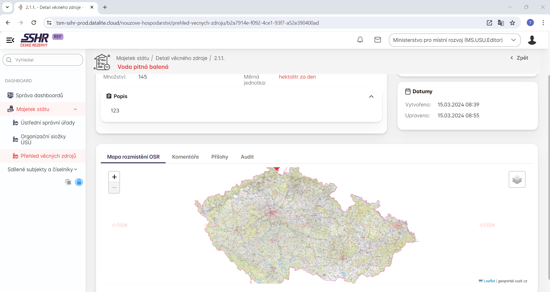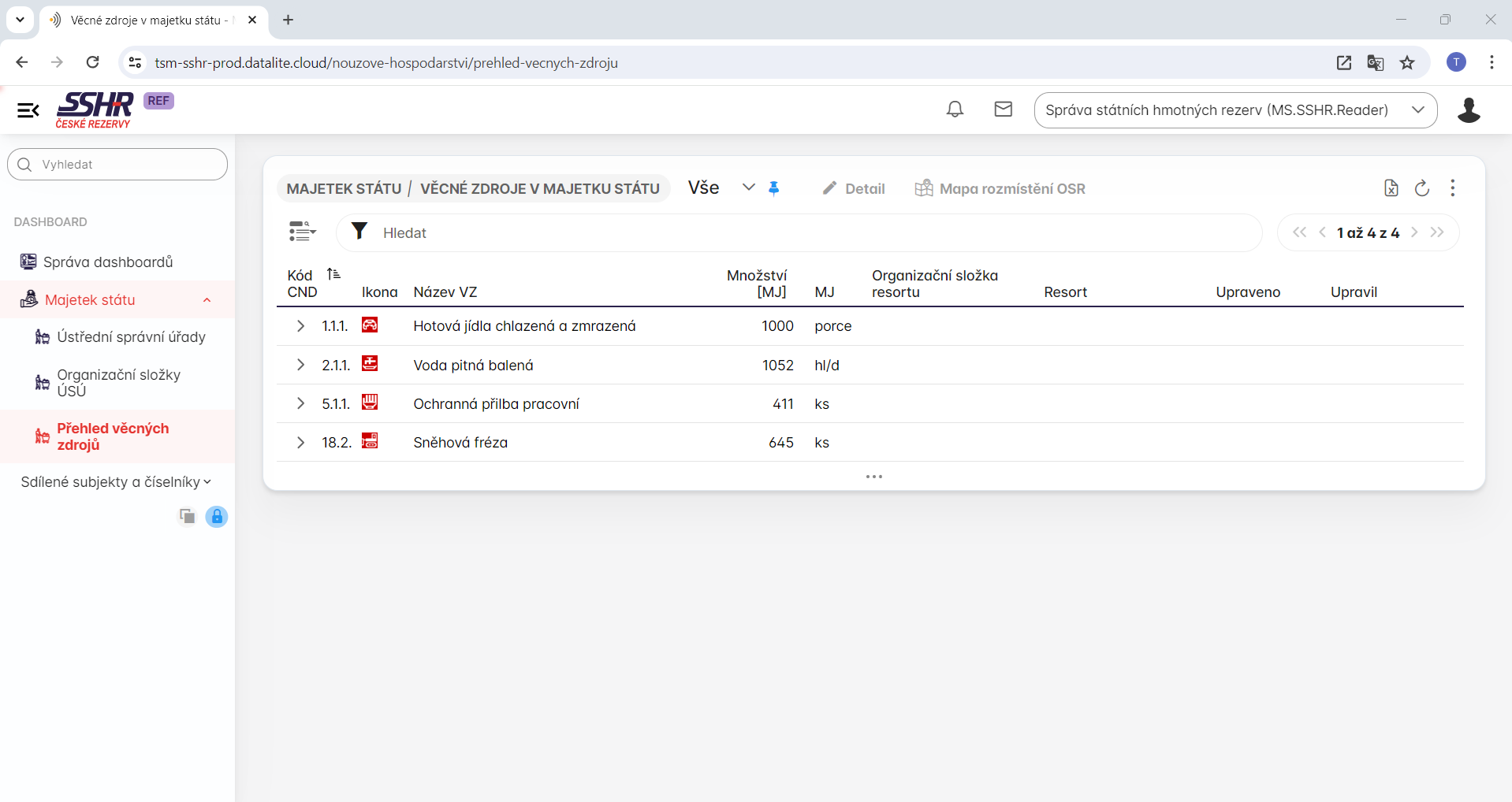 Část Věcné zdroje se nachází v modulu Majetek státu a slouží k zobrazení věcných zdrojů přiřazených konkrétním organizačním složkám ÚSÚ