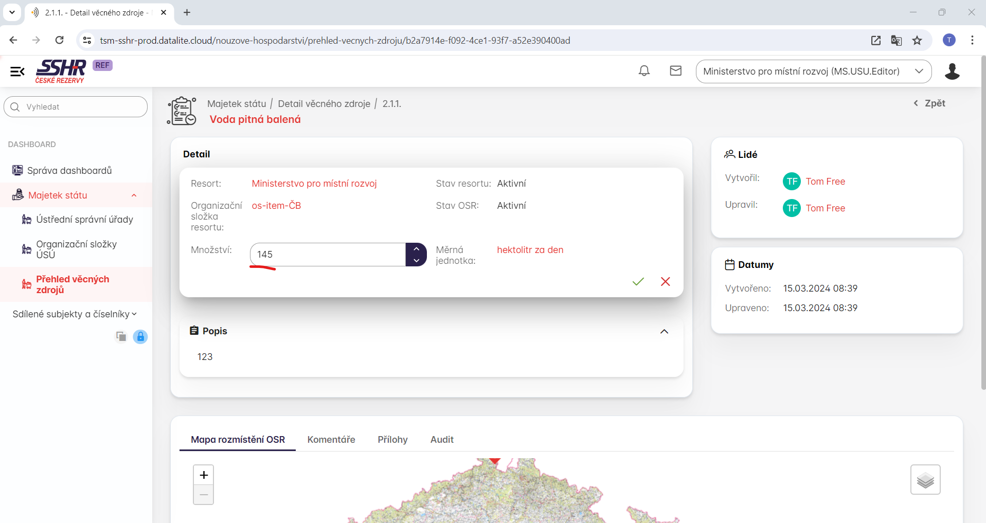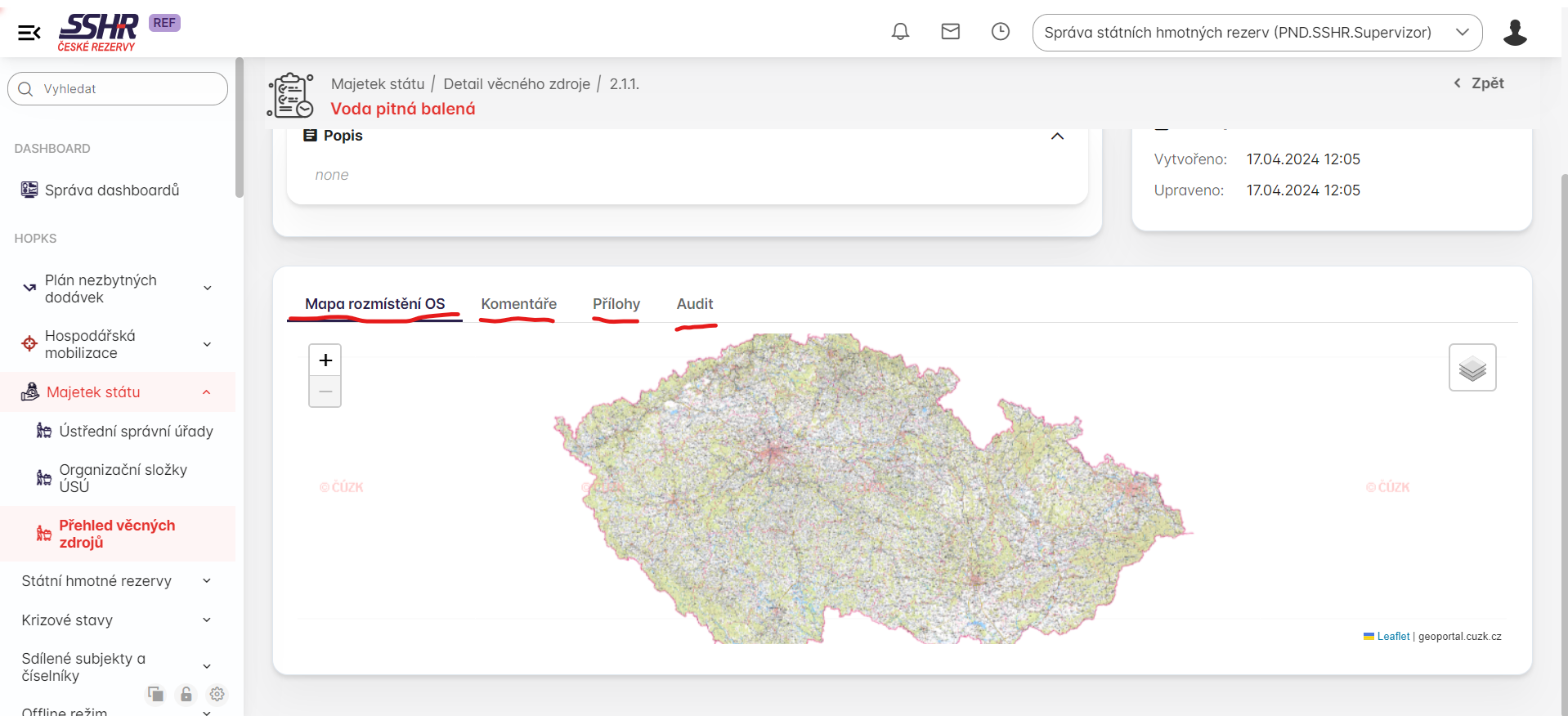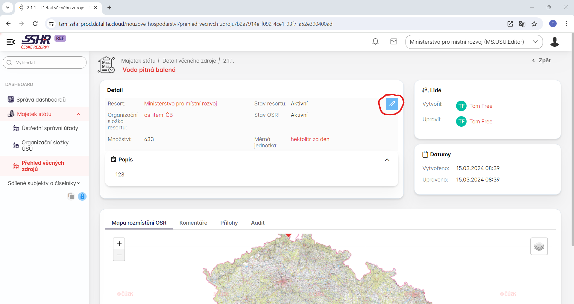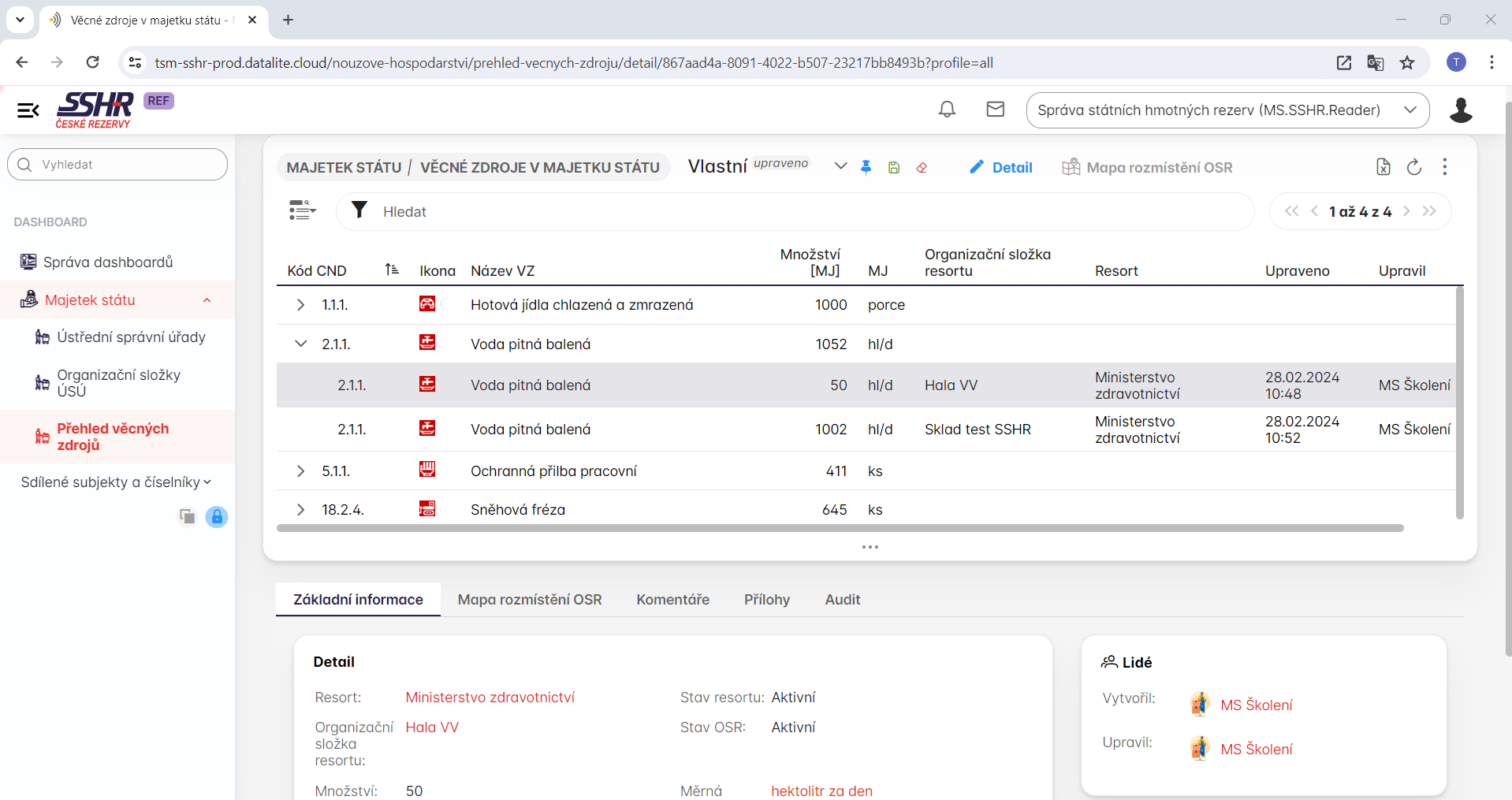 - Jedním kliknutím na záznam v tabulce věcných zdrojů se zobrazí náhled detailu vybraného záznamu, nebo pomocí kliknutí na tlačítko „Detail“ se zobrazí detail věcného zdroje. Záznamy se zobrazují v seznamu stromové struktury, pro zobrazení detailu je nutné rozkliknout vnořený záznam stromové struktury obdobná možnost zobrazení detailu je dvojité kliknutí na vnořený záznam