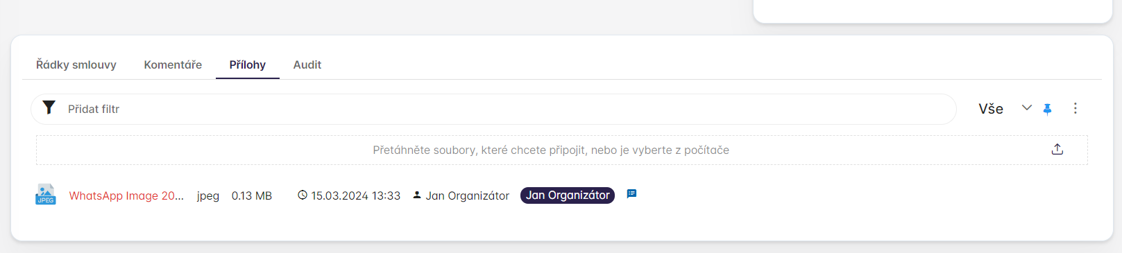 Po uložení přílohy se zobrazí řádek s informací o příloze