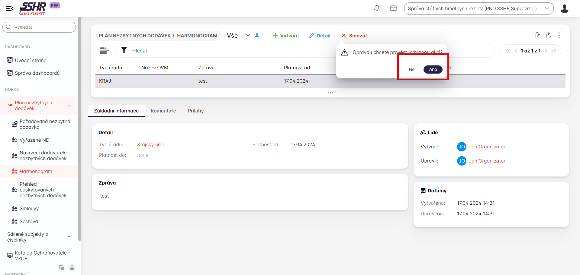 Kliknutí na tlačítko Detail uživatel otervře zvolený harmonogram a můžeme do něj přidat další přílohy, případně upravit datum od a do. Musí mít však správnou roli s oprávnění pro editaci harmonogramu a musí mít i přiřazený správný orgán veřejné moci.