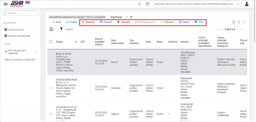 Pro přihlášeného uživatele s rolí PND.KHZS.Supervizor jsou ještě k dispozici tlačítka „Nová ND nad rámec" a „Aktualizace dat za dodavatele". Tato role může za dodavatele vyplňovat údaje k nezbytným dodávkám (viz další kapitola Poskytované zdroje), tj.