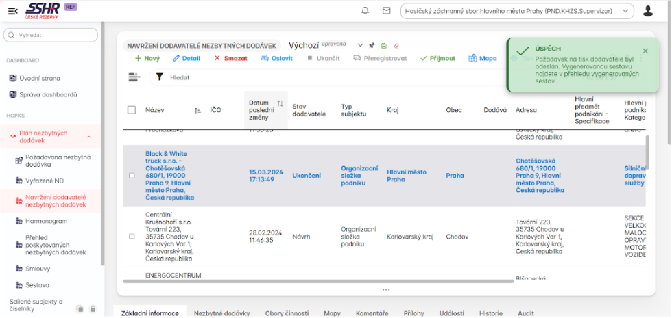 Kliknutím na tlačítko „Tisk" se zobrazí hláška „Úspěch" a vytvoří se tisková sestava dat vybraného dodavatele.