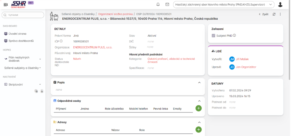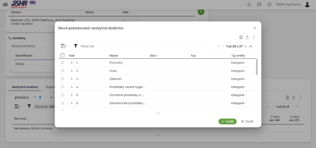 Jakmile je konkrétní organizace (Organizace nebo Organizační složka podniku) navržena jako navrženi dodavatel nezbytné dodávky (organizace je ve stavu "Návrh"), je možné přiřazovat k tomuto navrženému dodavateli konkrétní položky z číselníku nezbytných dodávek.