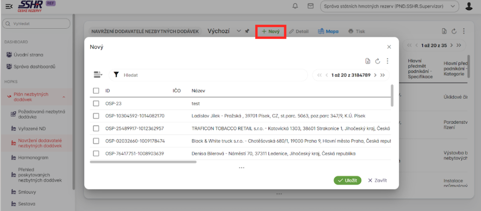 Kliknutím na zelené tlačítko „Nový" v horní části obrazovky se zobrazí formulář „Nový" s tabulkou dodavatelů z územní působnosti přiřazeného orgánu veřejné moci přihlášeného uživatele.