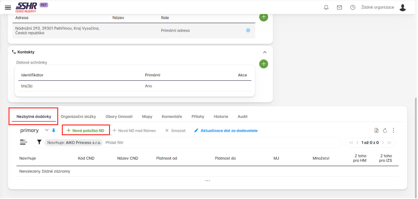 b) kliknutím na tlačítko „+ Nová položka ND" se zobrazí tabulka s číselníkem nezbytných dodávek