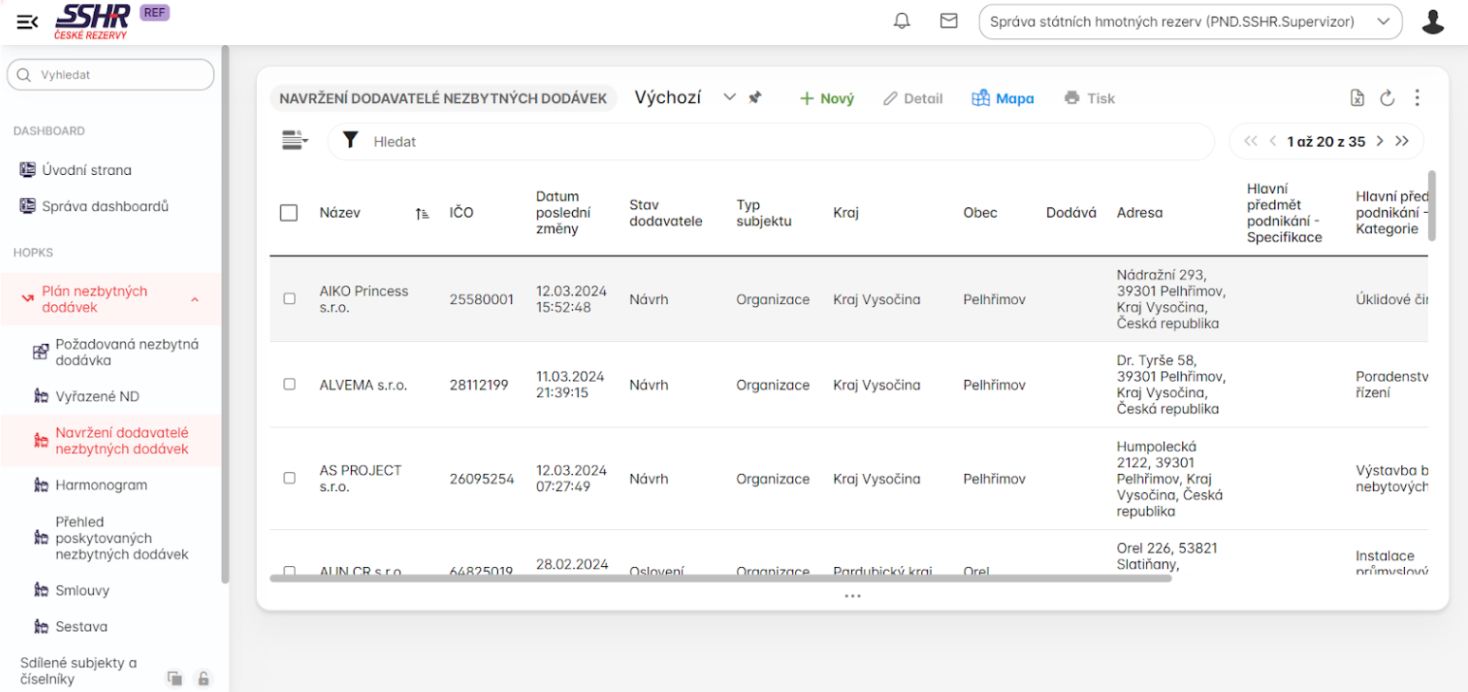 Kliknutím na „Navržení dodavatelé nezbytných dodávek" v menu se zobrazí přehled již navržených dodavatelů na požadované ND.