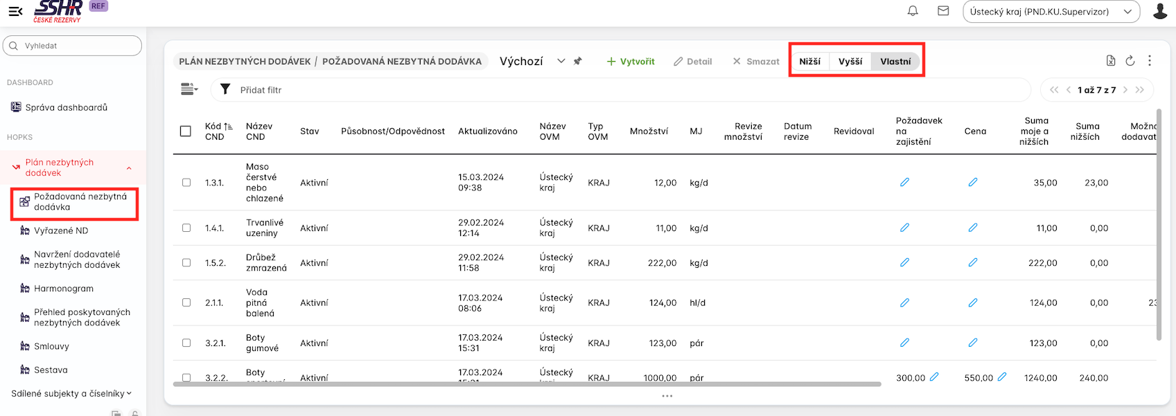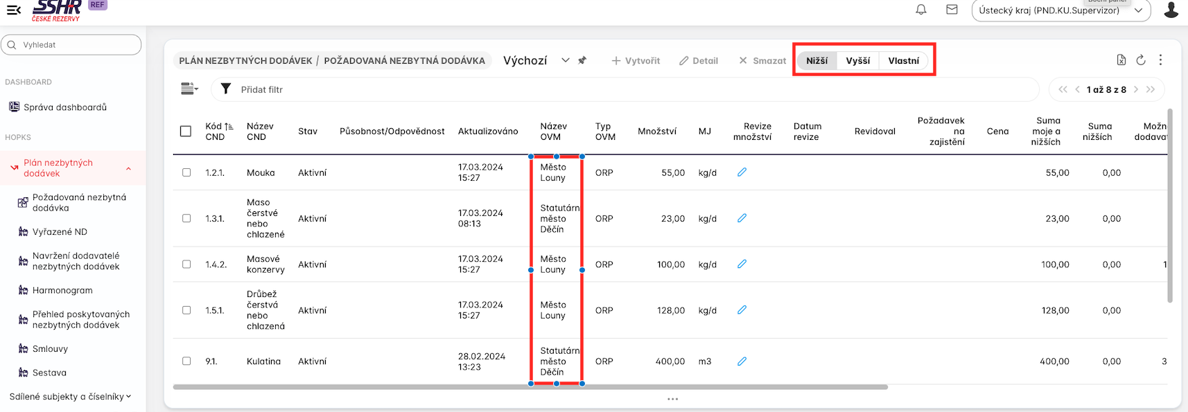 Uživatel má možnost přepínat mezi zobrazením "Vlastní", "Nižší" a "Vyšší", jako výchozí je nastaveno zobrazení "Vlastní", které ukazuje přehled požadovaných nezbytných dodávek přihlášeného uživatele (s přiřazeným OVM).