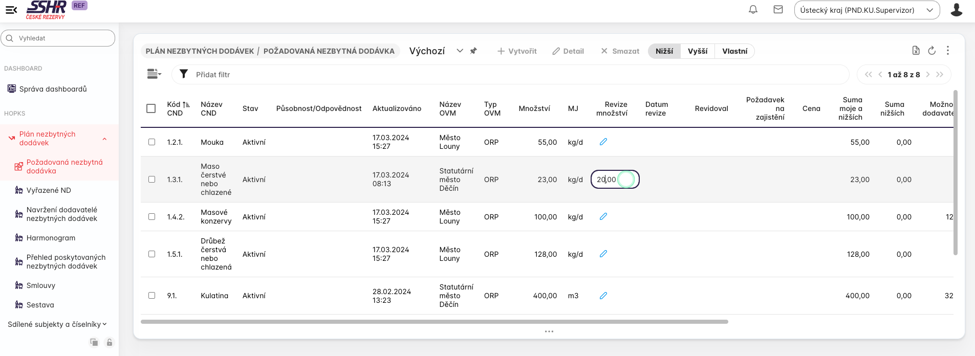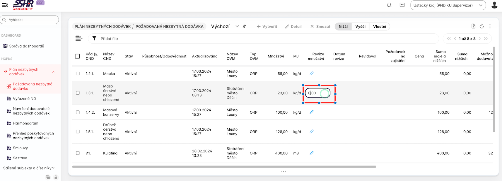 Uživatel v roli PND.KU.Supervizor může v pohledu "Nižší" revidovat množství požadované nezbytné dodávky ORP ve svém území (naznačeno na řádku 2 s zeleným kolečkem), a to po kliknutí na editační tužku přímo v seznamu.