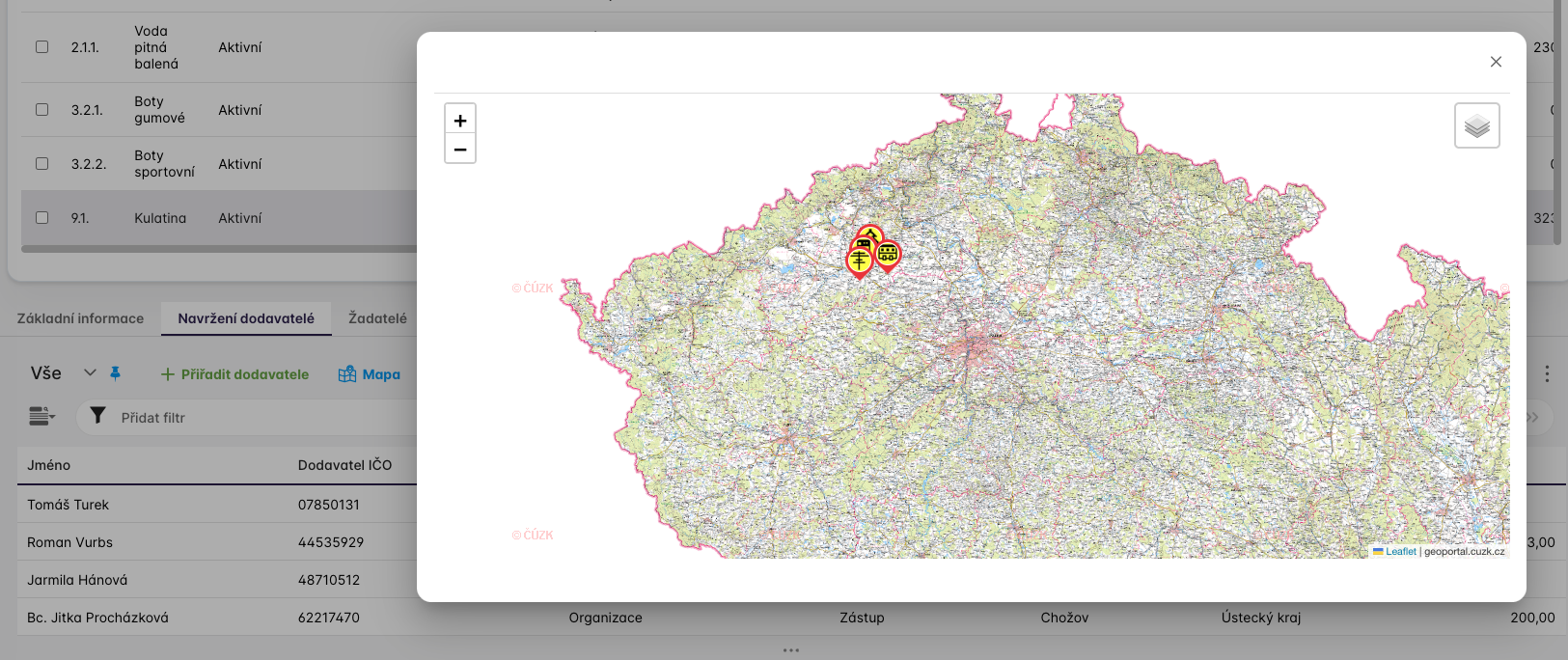 Zobrazení přiřazených navržených dodavatelů ND po kliknutí na tlačítko Mapa.