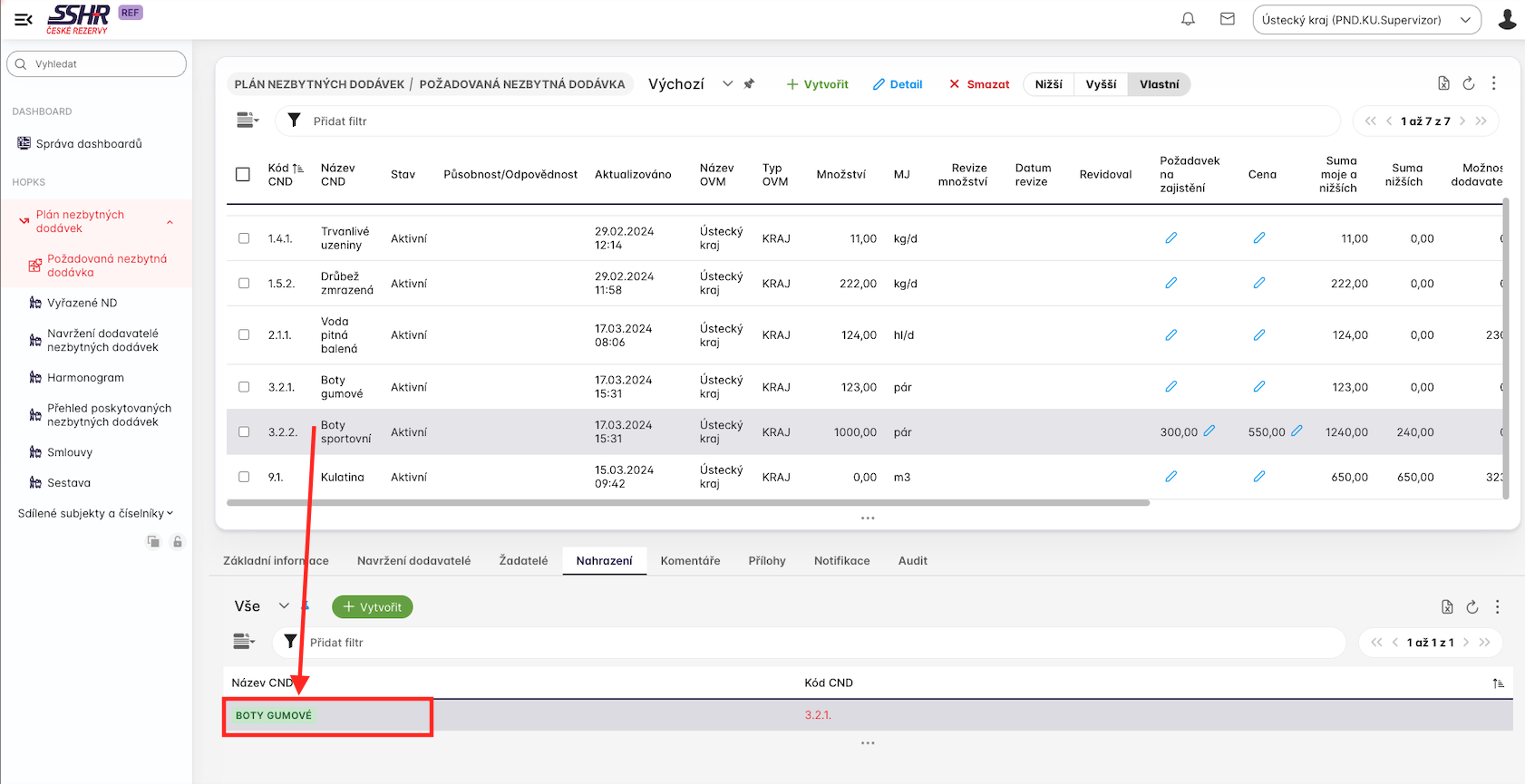 Uživatel podle zařazení do uživatelské skupiny (tedy i role PND.) a přiřazeného orgánu veřejné moci vidí přehled požadovaných nezbytných dodávek.