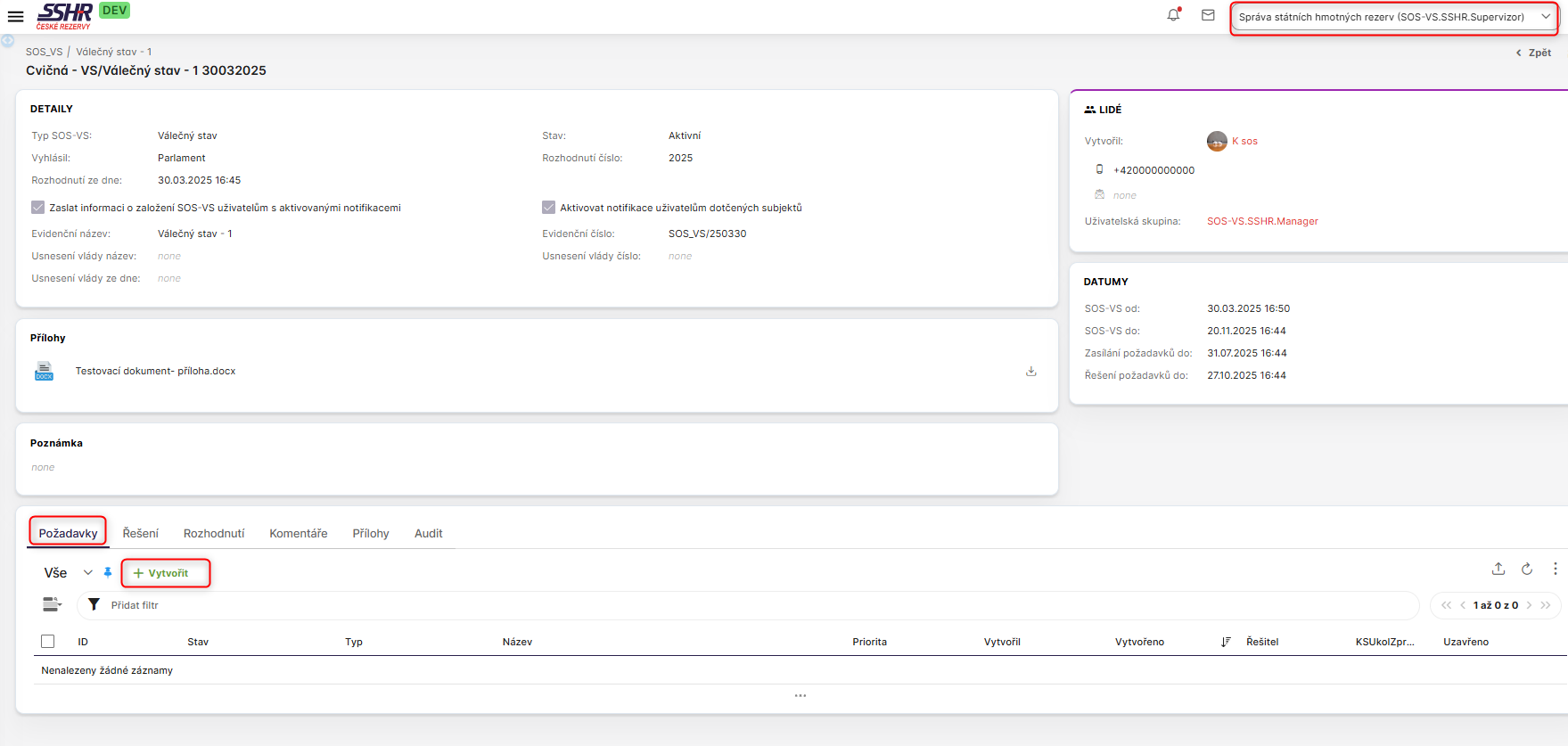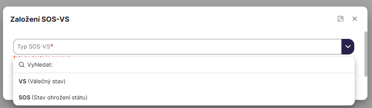 SOS-VS události má oprávnění vyhlašovat pouze role SOS-VS.SSHR.Manager.