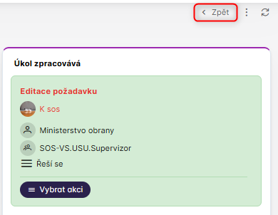 K návratu na listing z detailu požadavku slouží tlačítko Zpět v pravém horním rohu.
