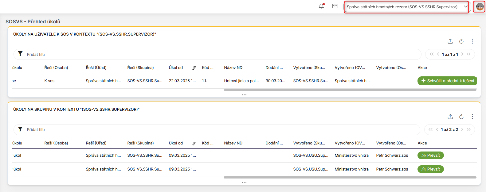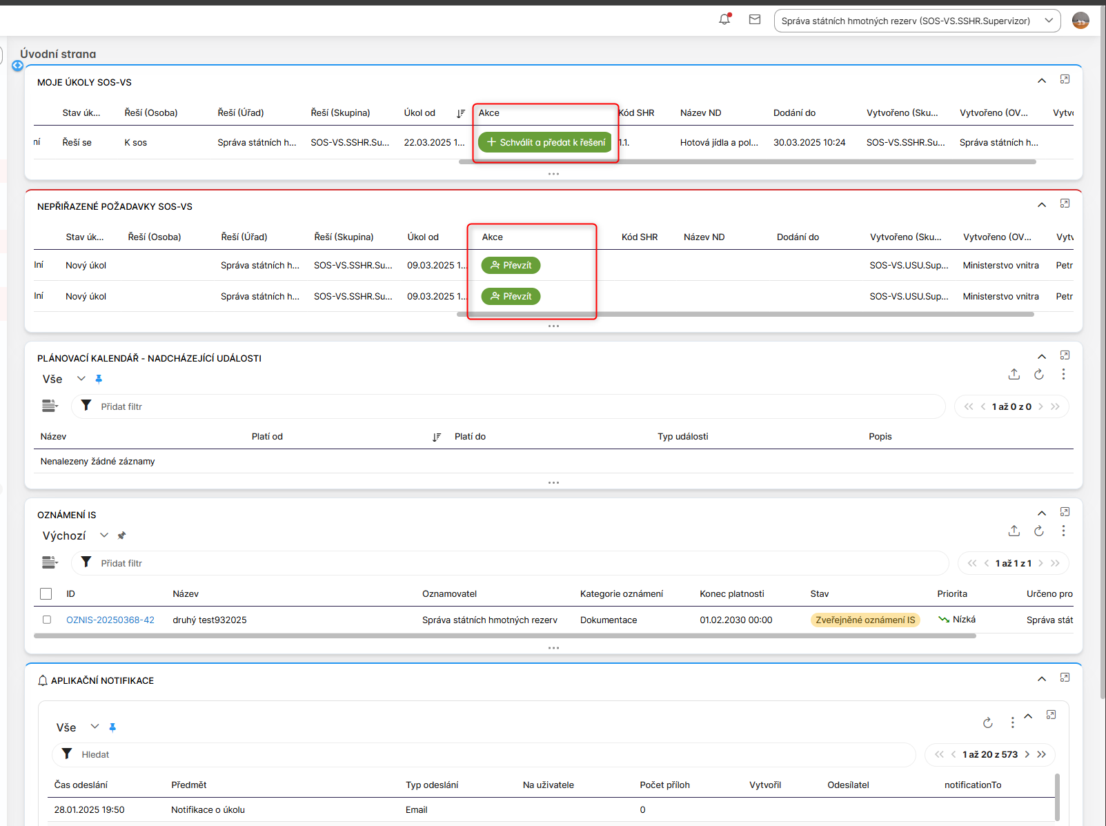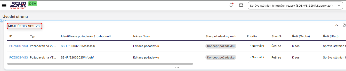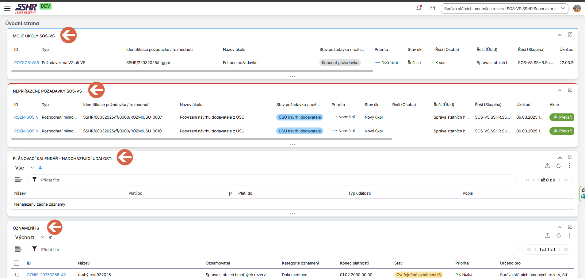 Na příkladu je zobrazena úvodní stránka pro uživatele, který je přihlášený pod rolí SOS-VS.SSHR.