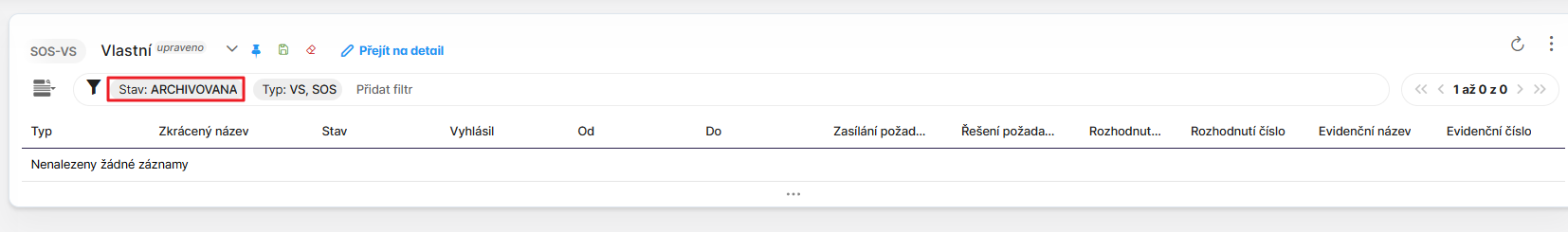 Rozkliknutím obsahu Archivované SOS-VS se zobrazí seznam všech SOS-VS, v kontextu přihlášeného uživatele v konkrétní roli, ve stavu archivovaná.