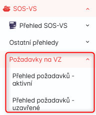 Jednotlivé požadavky, které byly založeny pod konkrétní SOS-VS události se zobrazují v komponentě Požadavky na VZ. V podkomponentě Přehled požadavků- uzavřené se nachází seznam všech požadavků ve stavu Požadavek dokončen nebo Požadavek zamítnut. Požadavky ve všech ostatních stavech jsou v Přehledu požadavků- aktivní.