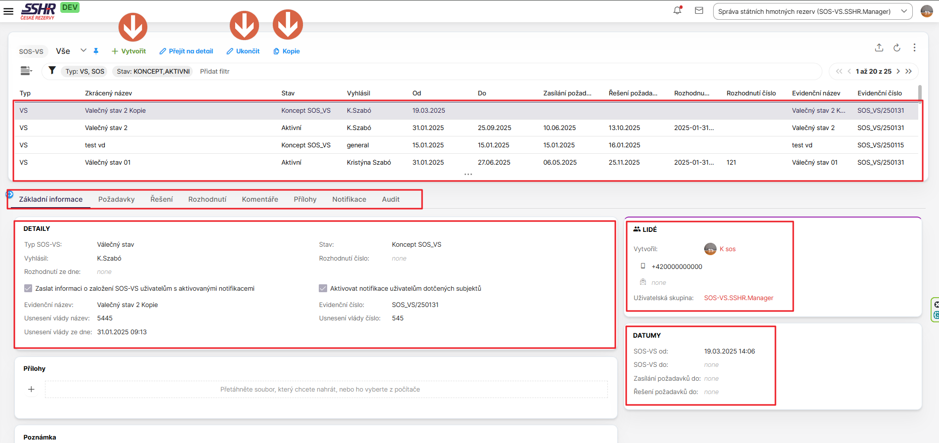 Pokud je přihlášený uživatel s rolí např. SOS-VS.SSHR.Supervizor, zobrazí se nad listingem událostí tlačítka pro vytvoření a ukončení SOS-VS a také pro vytvoření kopie označené SOS-VS události.