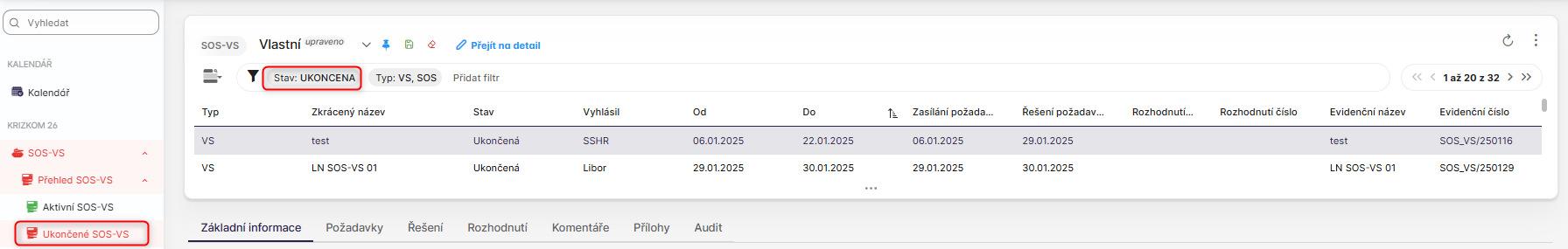 Rozkliknutím obsahu Ukončené SOS-VS se zobrazí seznam všech SOS-VS, v kontextu přihlášeného uživatele v konkrétní roli, ve stavu ukončená.
