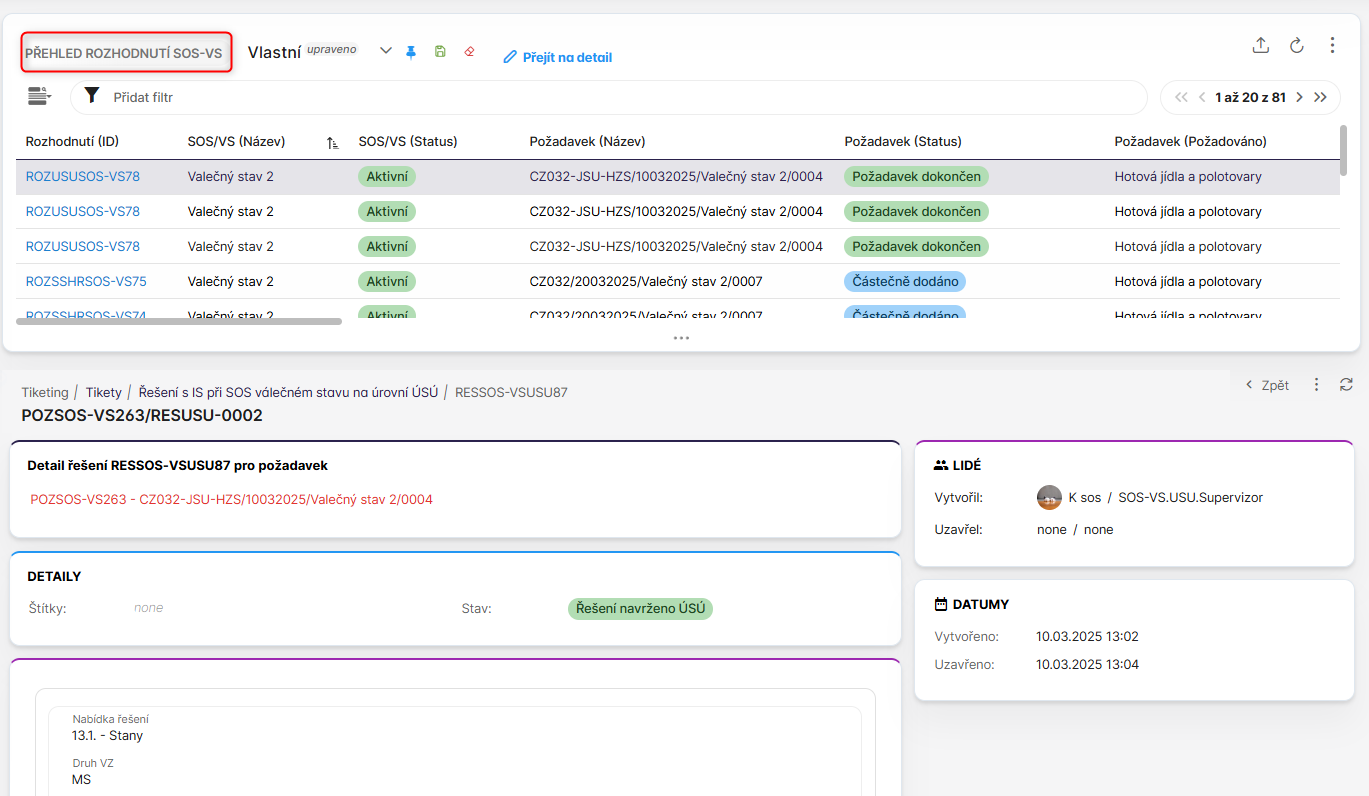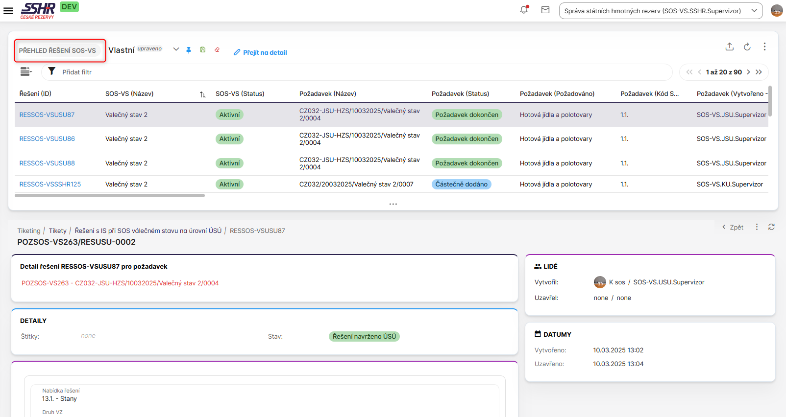 Zobrazí se listing se všemi řešeními z požadavků, které jsou dostupné přihlášenému uživateli v konkrétní roli. Listing obsahuje informace ke konkrétnímu řešení, k požadavku, pod kterým bylo vytvořeno a SOS-VS události, které se týká.