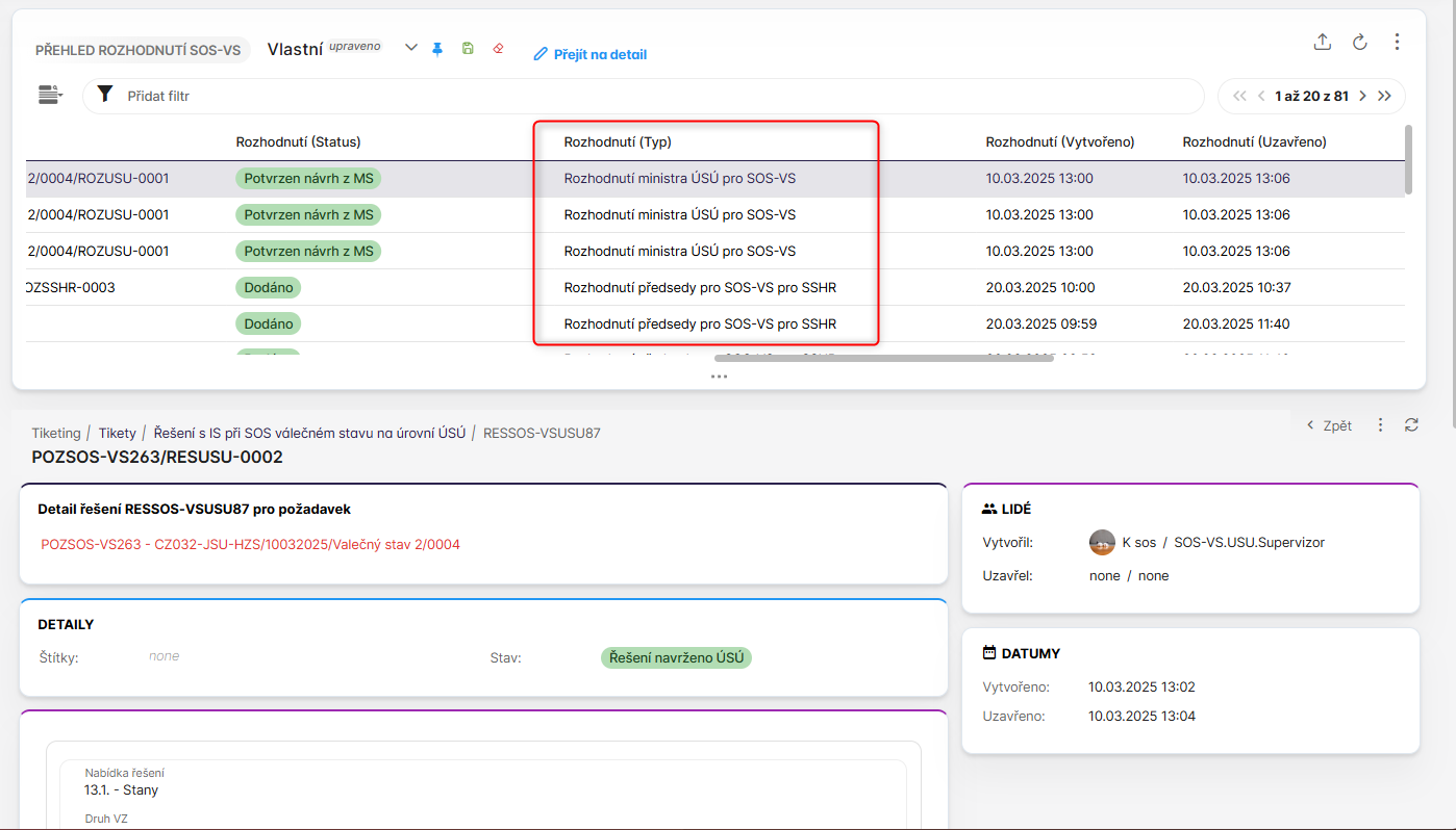 Zobrazí se listing se všemi rozhodnutími z požadavků, které jsou dostupné přihlášenému uživateli v konkrétní roli. Listing obsahuje informace ke konkrétnímu rozhodnutí, k požadavku, pod kterým bylo vytvořeno a SOS-VS události, které se týká.